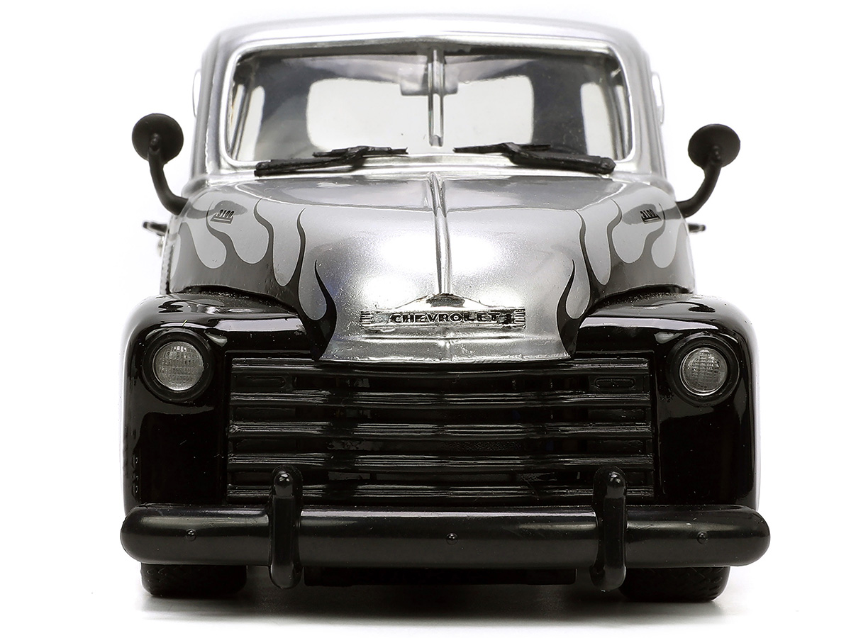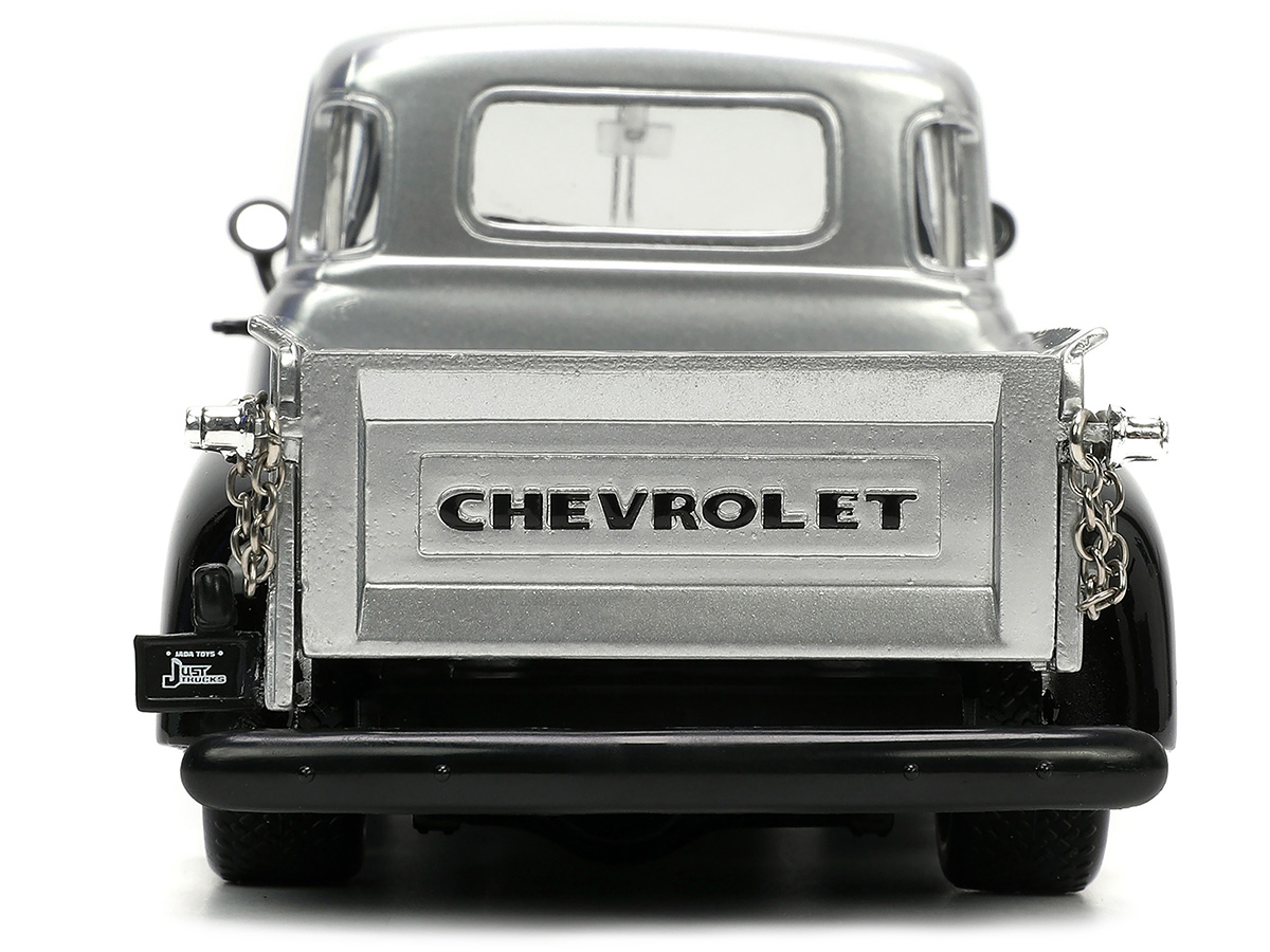 - Brand new 1/24 scale diecast car model of 1953 Chevrolet 3100 Pickup Truck Silver Metallic with Black Flames with Extra Wheels “Just Trucks” Series die cast model car by Jada.