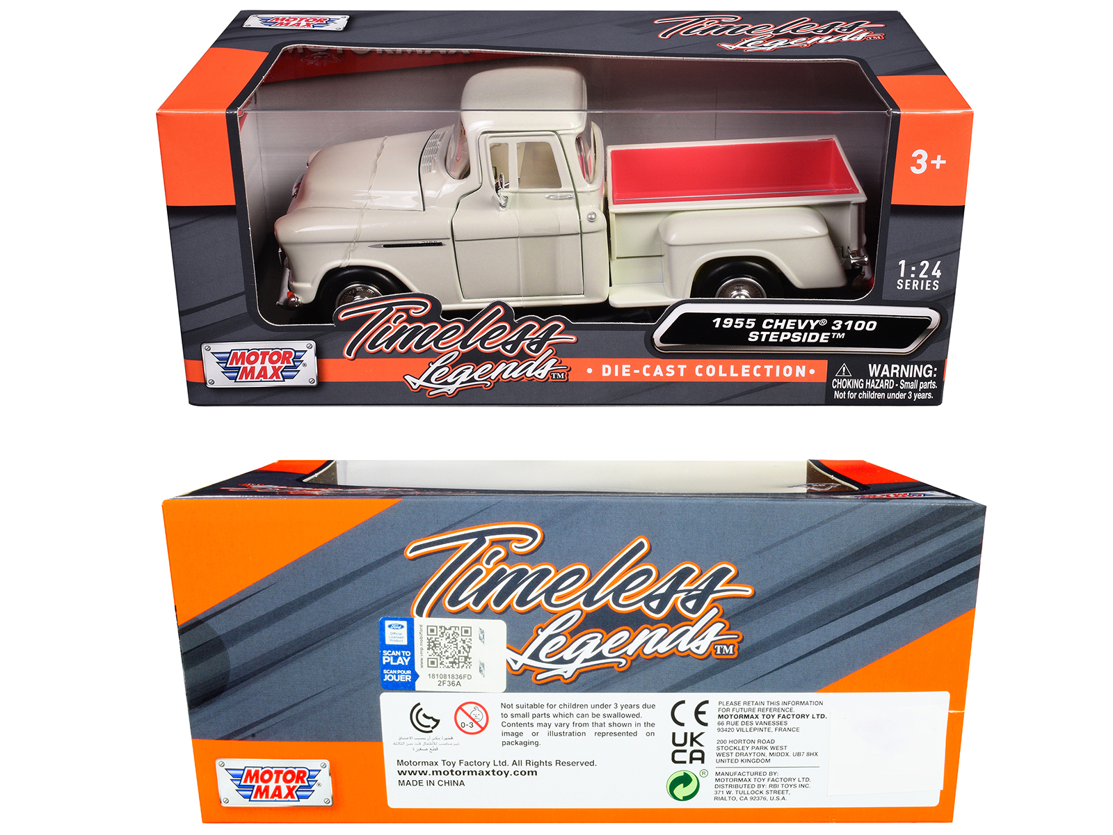 - Brand new 1/24 scale diecast model car of 1955 Chevrolet 3100 Stepside Pickup Truck Cream with White Interior “Timeless Legends” Series die cast car model by Motormax.