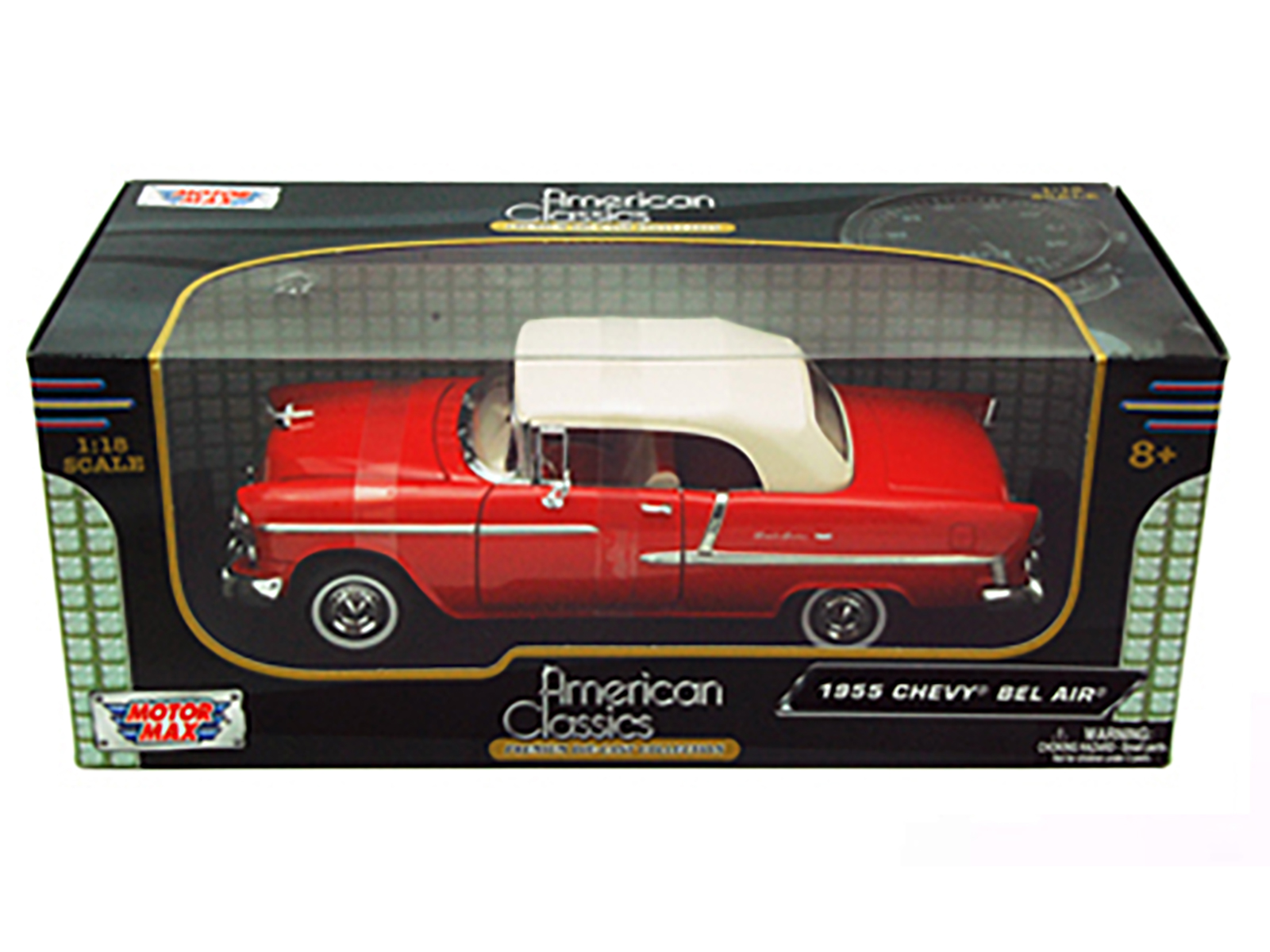 - Brand new 1:18 scale diecast car model of 1955 Chevrolet Bel Air Convertible Soft Top Red die cast car model by Motormax.