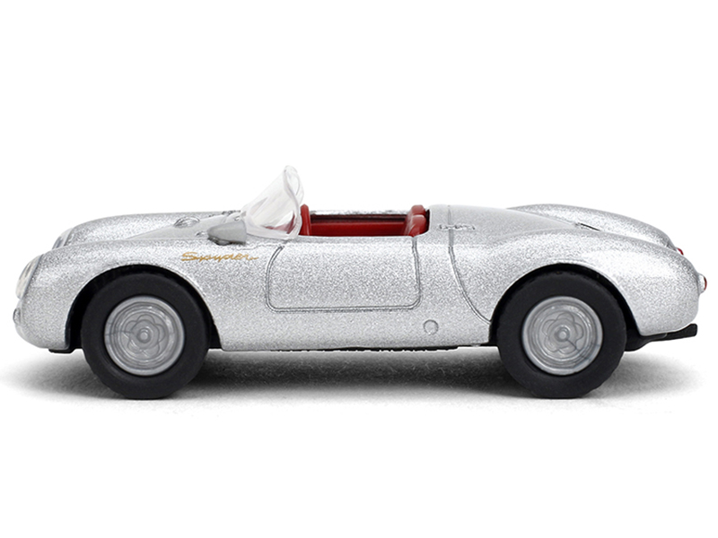 - Brand new 1/64 scale diecast car model of 1955 Porsche 550 Spyder Silver Metallic with Red Interior “Collection” Series die cast model car by Majorette.