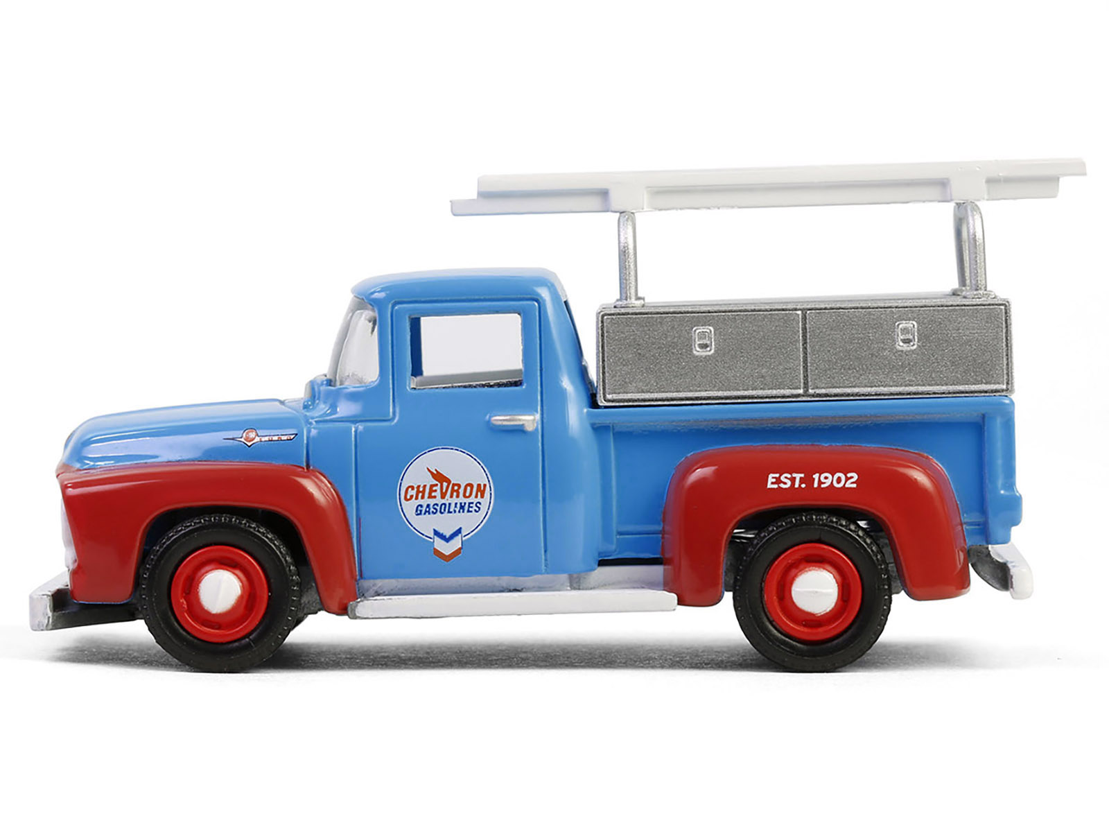 - Brand new 1/64 scale diecast car model of 1956 Ford F-100 Pickup Truck with Tool Boxes and Ladders “Chevron” Blue and Red “Chevron Special Edition” Series 1 die cast model car by Greenlight.