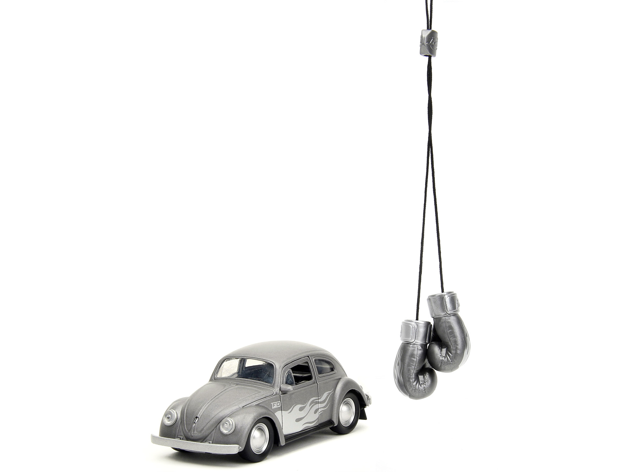 - Brand new 1/32 scale diecast car model of 1959 Volkswagen Beetle Gray Metallic with Silver Flames and Boxing Gloves Accessory “Punch Buggy” Series die cast model car by Jada.