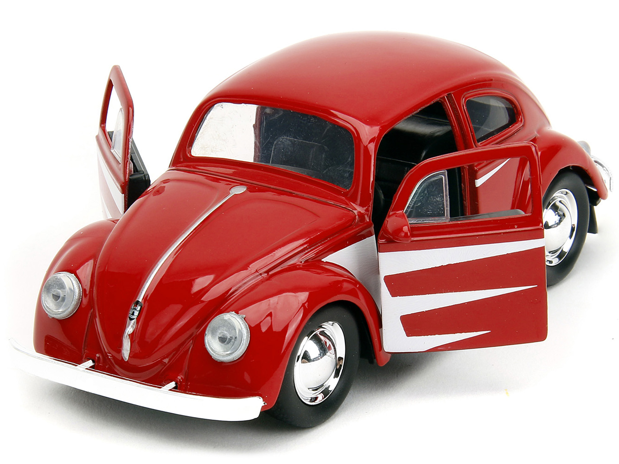 - Brand new 1/32 scale diecast car model of 1959 Volkswagen Beetle Red with White Graphics and Boxing Gloves Accessory “Punch Buggy” Series die cast model car by Jada.