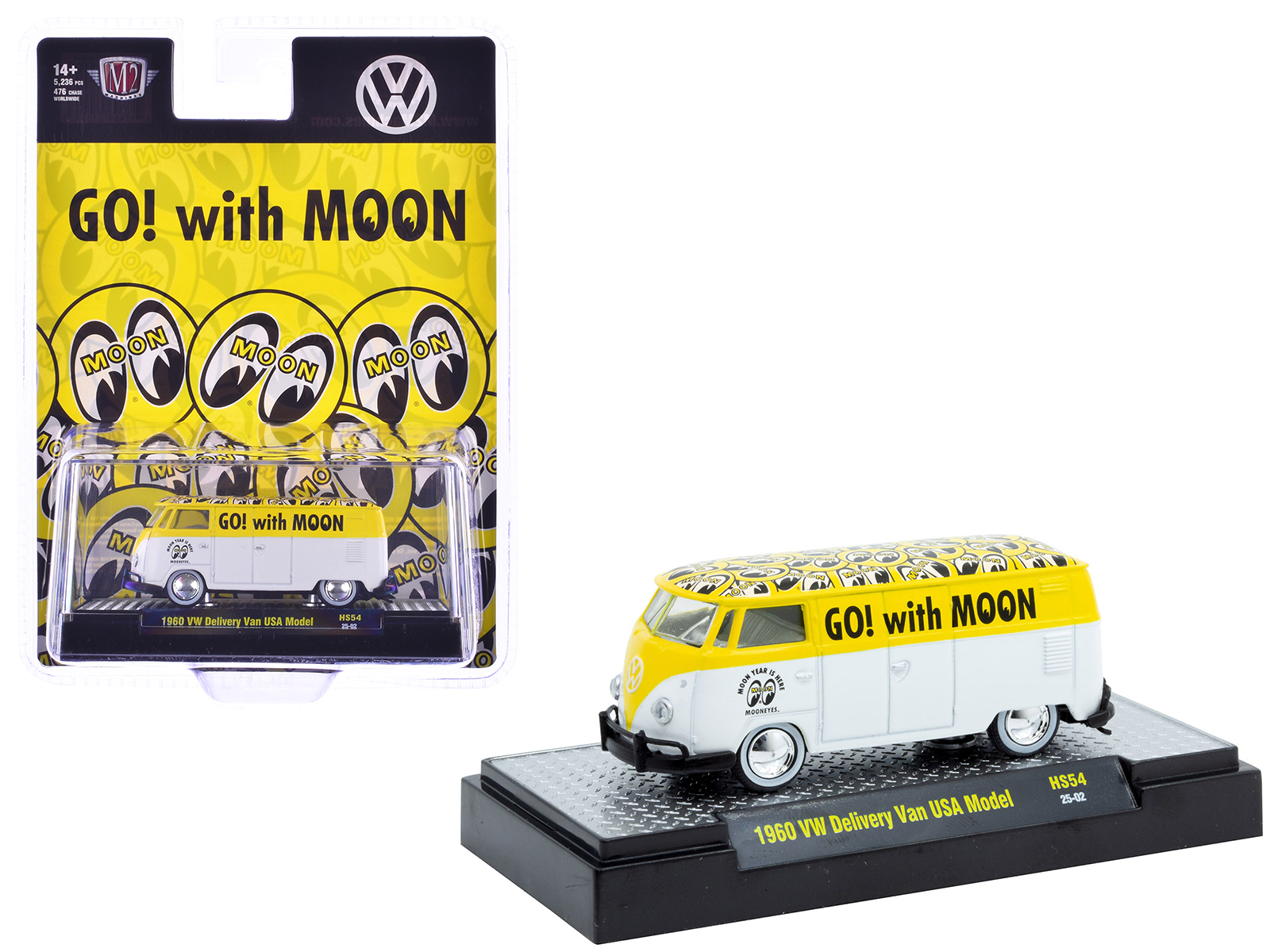 - Brand new 1/64 scale diecast car model of 1960 Volkswagen Delivery Van USA Model “MoonEyes” White and Yellow with Top Graphics and White Interior Limited Edition to 5236 pieces Worldwide die cast model car by M2 Machines.