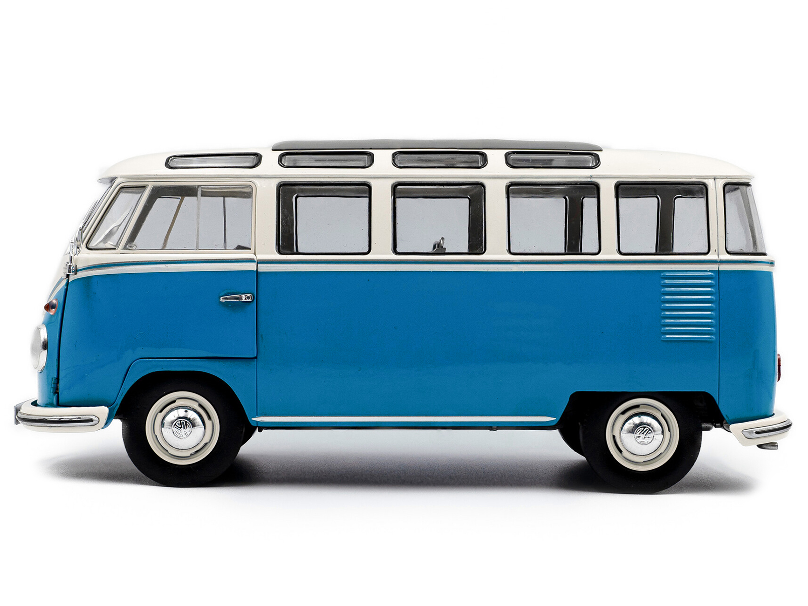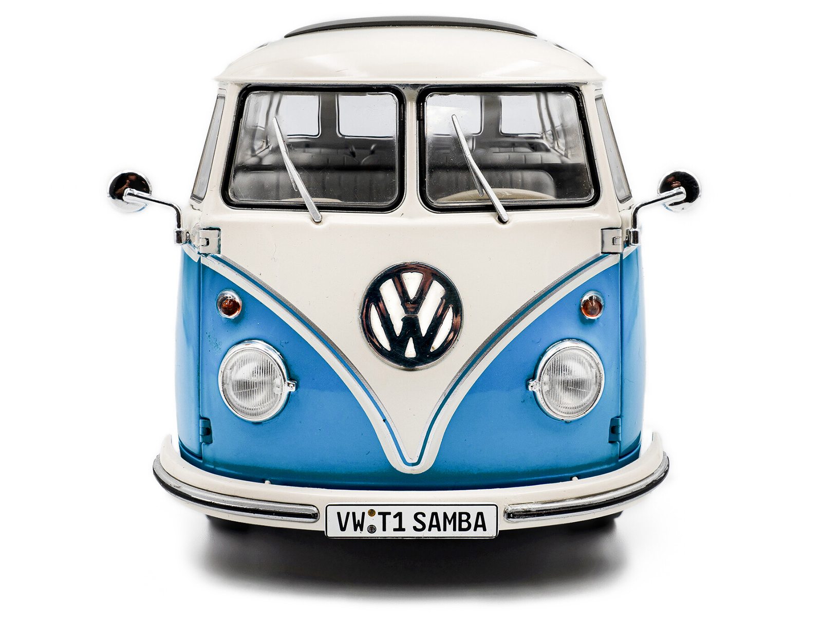 - Brand new 1/18 scale diecast car model of 1962 Volkswagen T1 Samba Bus Baby Blue and White die cast model car by Solido.