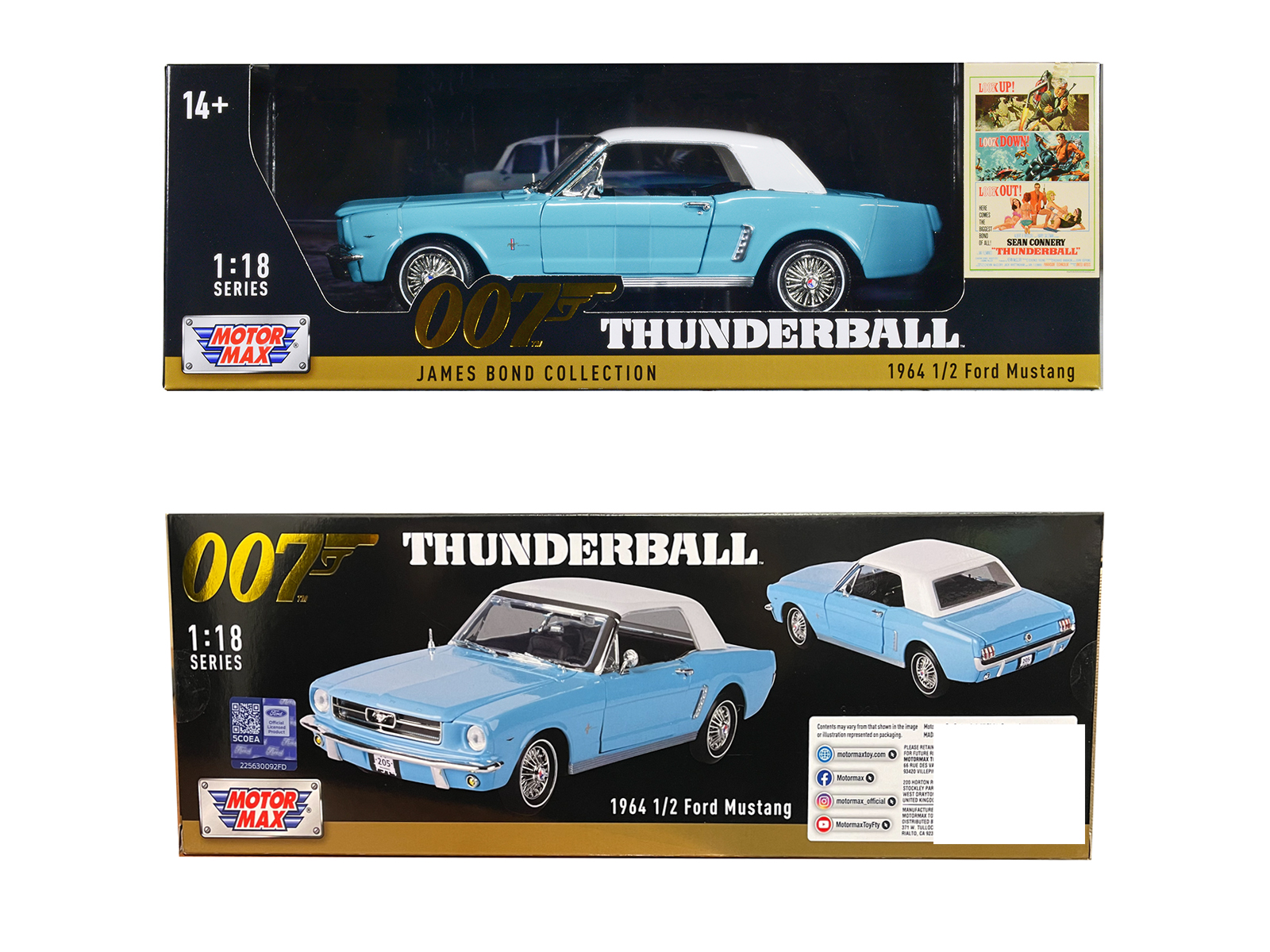 - Brand new 1/18 scale diecast car model of 1964 1/2 Ford Mustang Light Blue with White Top James Bond 007 “Thunderball” (1965) Movie “James Bond Collection” Series die cast model car by Motormax.