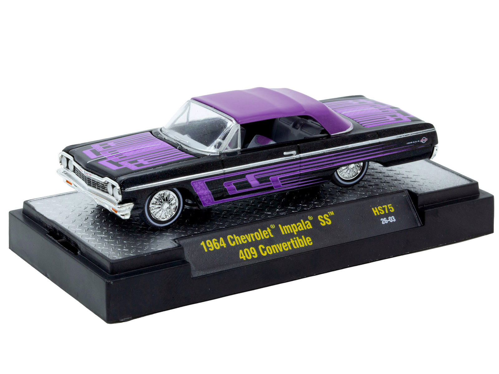 - Brand new 1/64 scale diecast car model of 1964 Chevrolet Impala SS 409 Convertible Black Metallic with Purple Graphics and Purple Soft Top Limited Edition to 11000 pieces Worldwide die cast model car by M2 Machines.