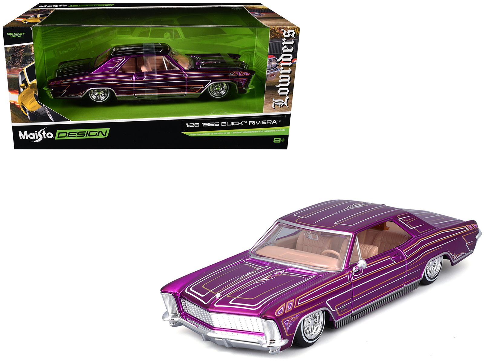 - Brand new 1/26 scale diecast car model of 1965 Buick Riviera Lowrider Purple Metallic with Graphics “Lowriders” Series die cast model car by Maisto.