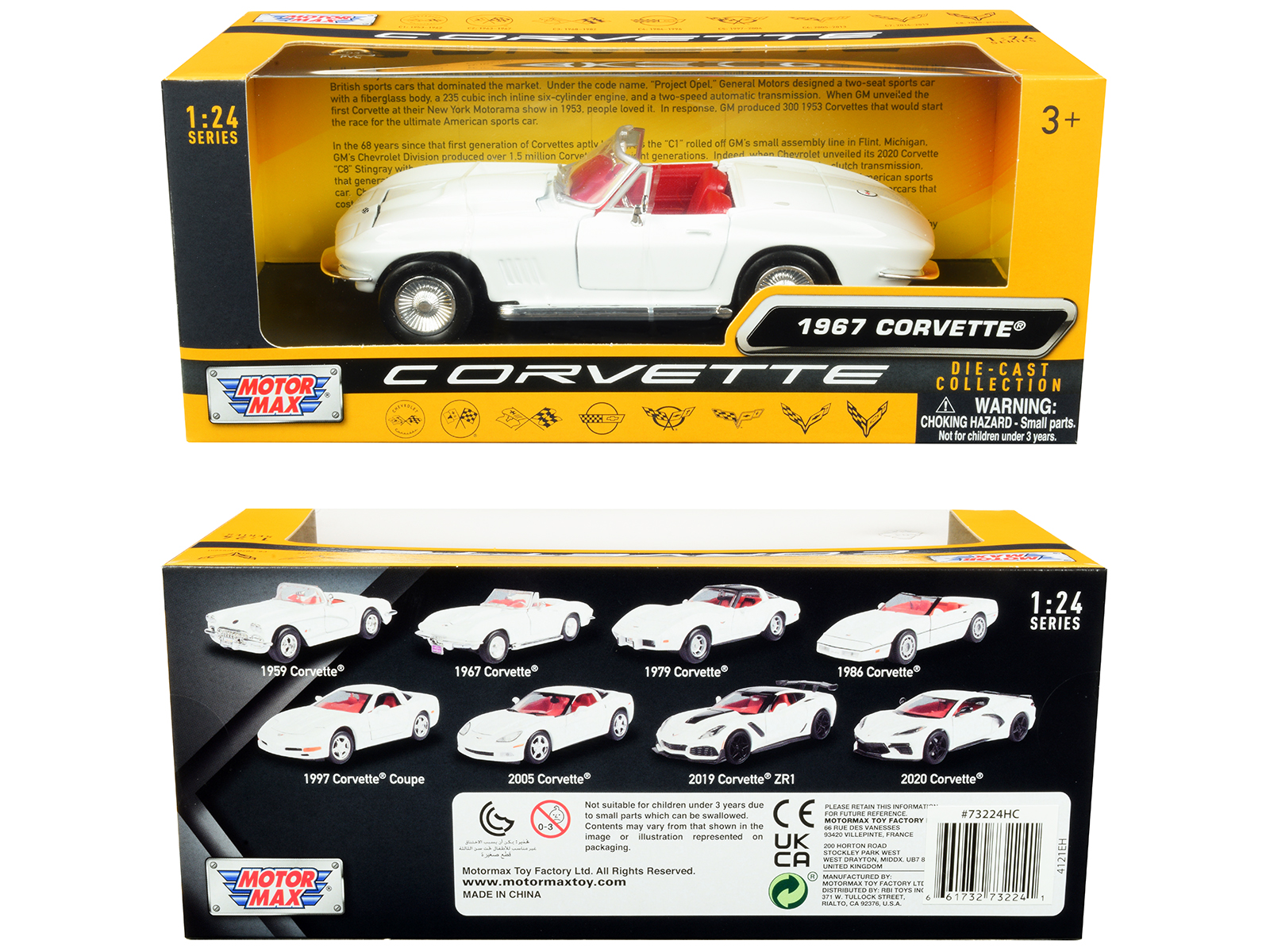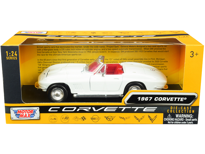 - Brand new 1/24 scale diecast car model of 1967 Chevrolet Corvette C2 Convertible White with Red Interior “History of Corvette” Series die cast model car by Motormax.