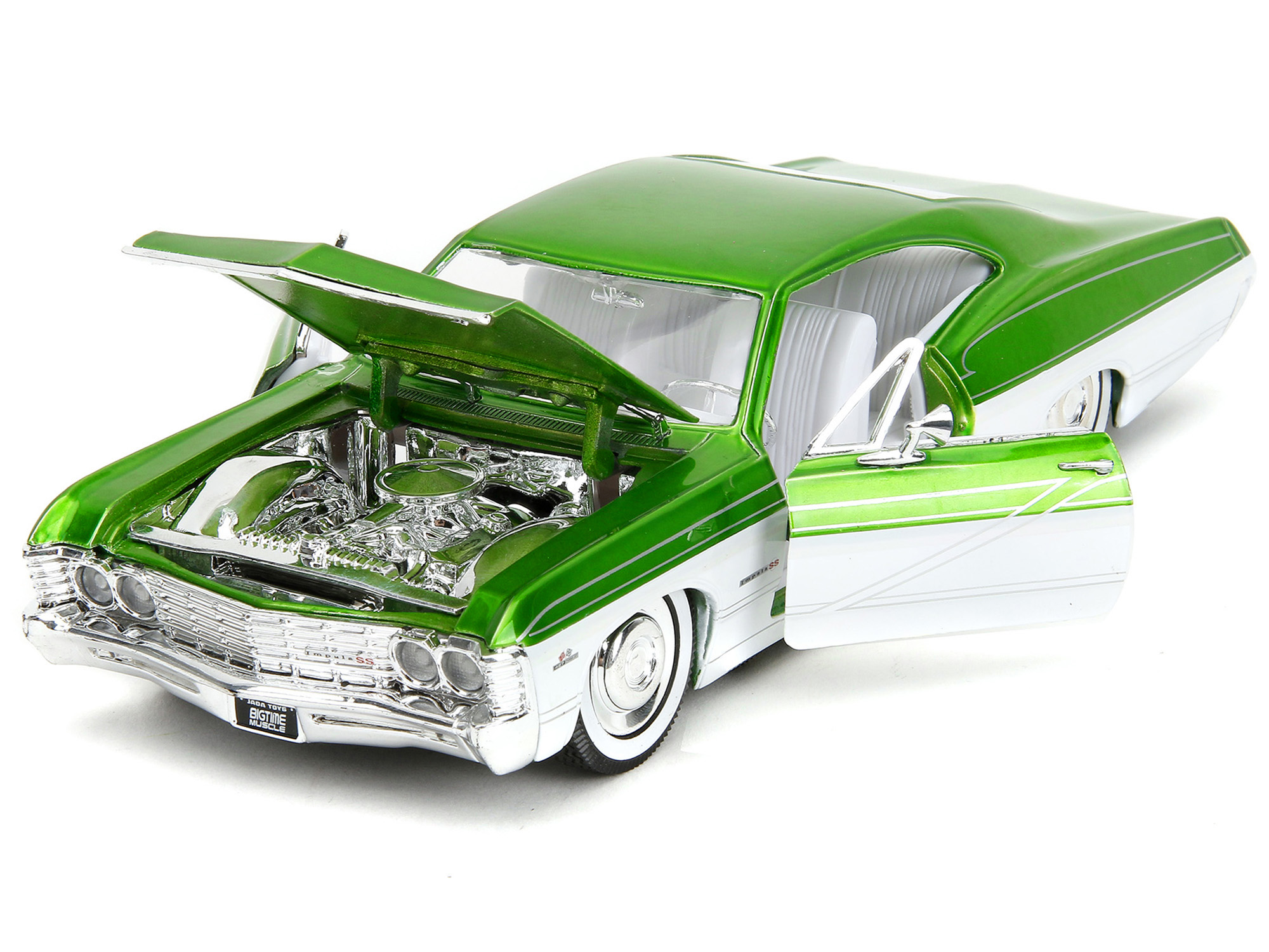 - Brand new 1/24 scale diecast car model of 1967 Chevrolet Impala SS Green Metallic and White with White Interior “Bigtime Muscle” Series die cast model car by Jada.