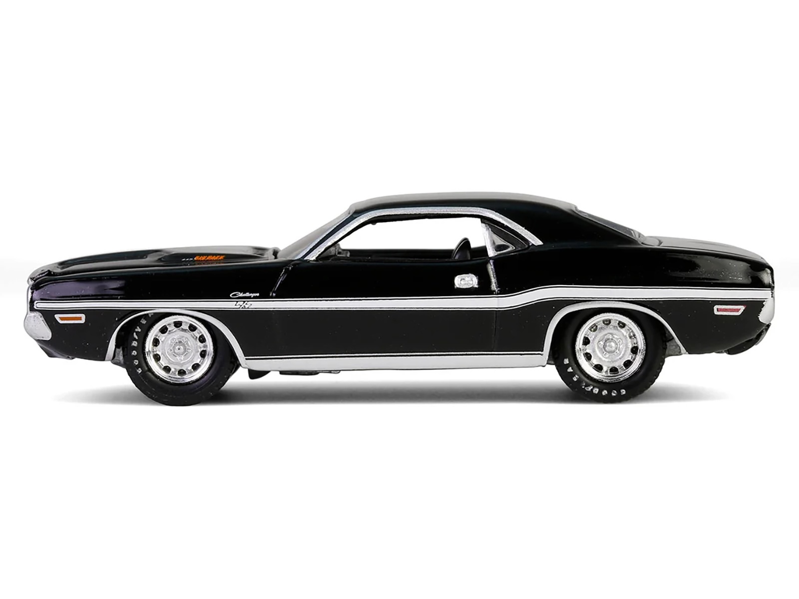 - Brand new 1/64 scale diecast car model of 1970 Dodge Challenger R/T 440 Black with White Stripes “Barrett-Jackson” Series 15 die cast model car by Greenlight.