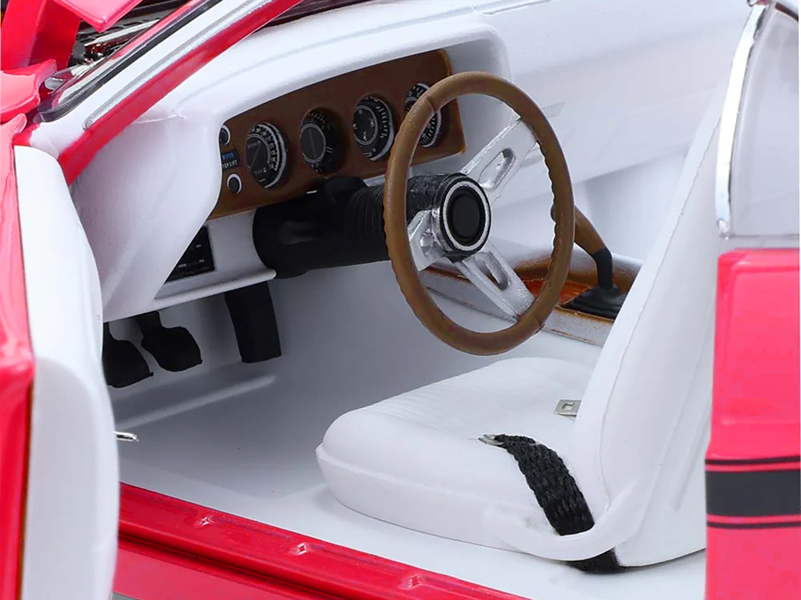 - Brand new 1/18 scale diecast car model of 1970 Dodge Challenger R/T 440 Six Pack Panther Pink with Black Stripes, White Top and White Interior die cast model car by Greenlight.