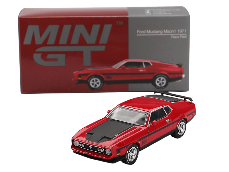 - Brand new 1/64 scale diecast car model of 1971 Ford Mustang Mach 1 Race Red with Black Hood and Stripes Limited Edition die cast model car by Mini GT.