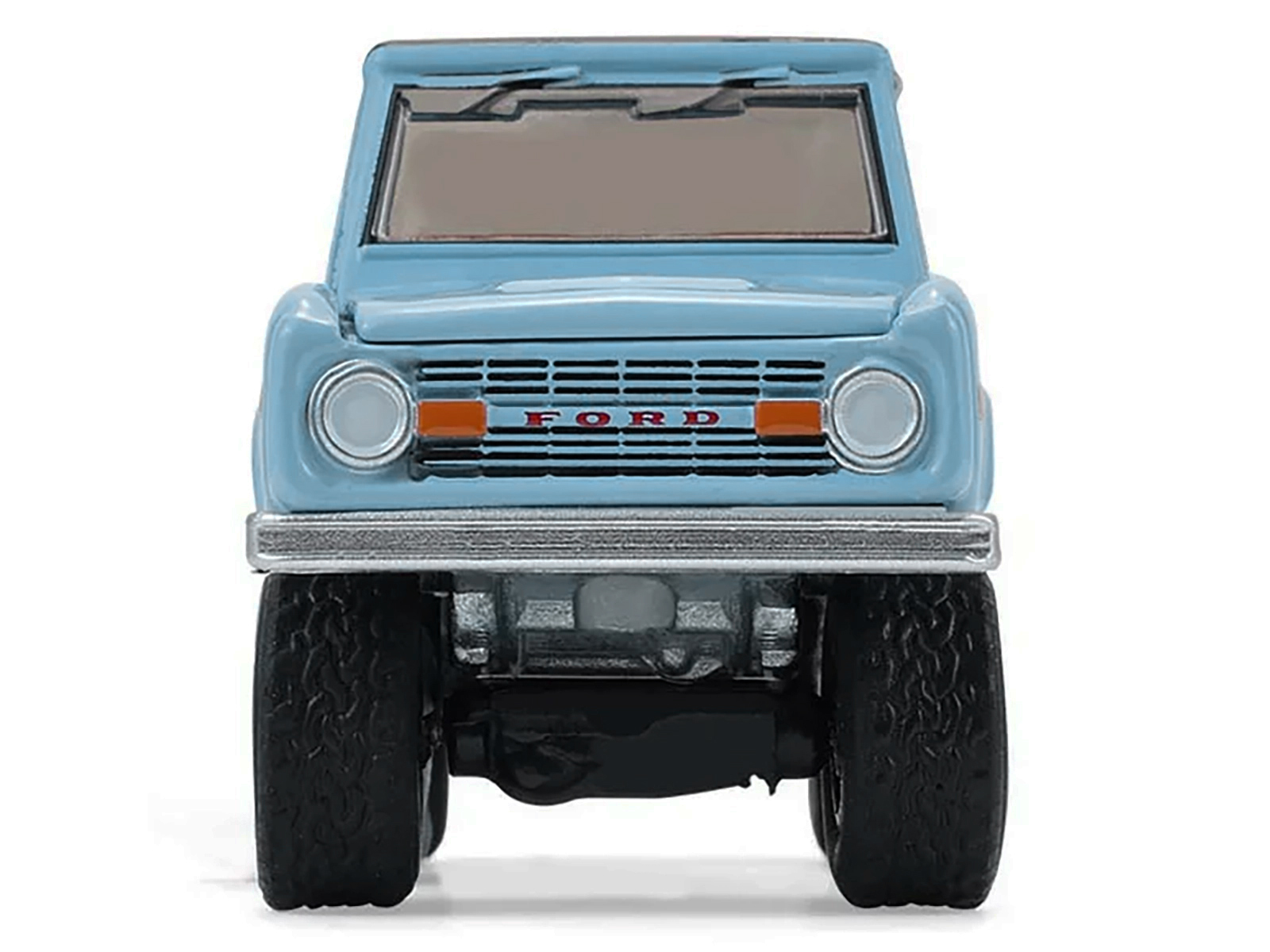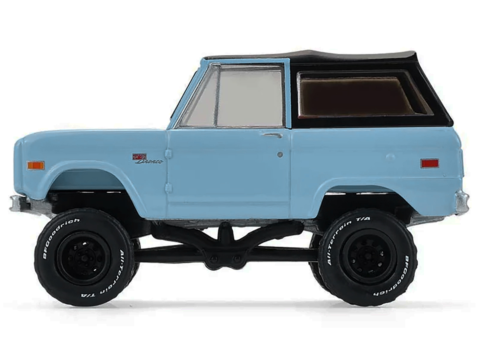 - Brand new 1/64 scale diecast car model of 1972 Ford Bronco Custom SUV Light Blue with Black Top “Barrett-Jackson” Series 16 die cast model car by Greenlight.