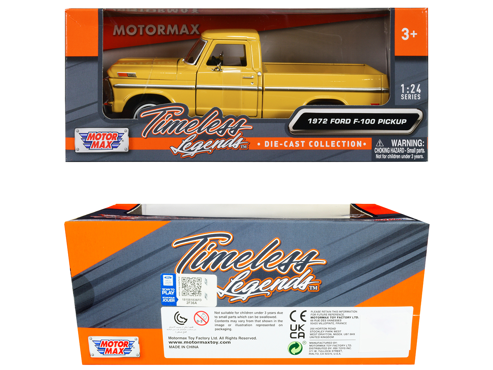 - Brand new 1/24 scale diecast car model of 1972 Ford F-100 Pickup Truck Yellow “Timeless Legends” Series die cast model car by Motormax.