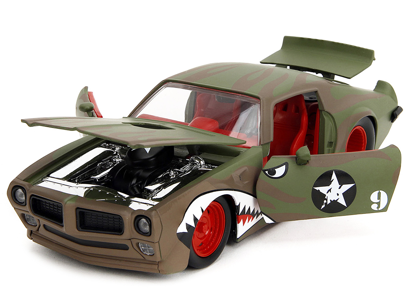 - Brand new 1/24 scale diecast car model of 1972 Pontiac Firebird #9 Green Camouflage Flames with Graphics and Red Interior “Bigtime Muscle” Series die cast model car by Jada.