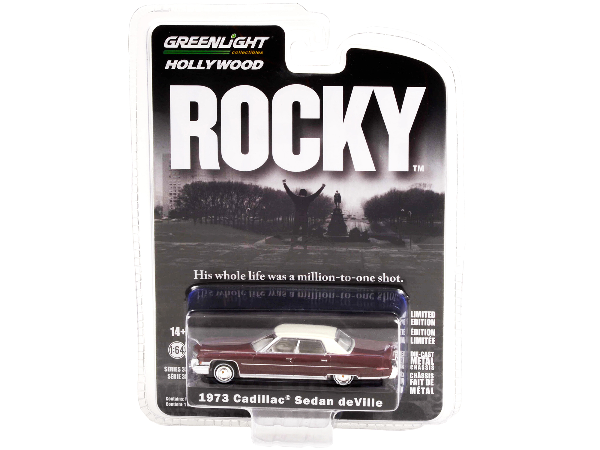 - Brand new 1/64 scale diecast car model of 1973 Cadillac Sedan DeVille Burgundy with White Top “Rocky” (1976) Movie “Hollywood Series” Release 35 die cast model car by Greenlight.