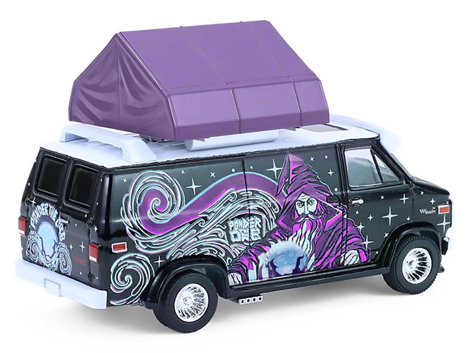 - Brand new 1/64 scale diecast model of 1978 GMC Vandura Custom Van Black with Wizard Graphics and White Top with Camp’otel Cartop Sleeper Tent “The Great Outdoors” Series 4 die cast model car by Greenlight.