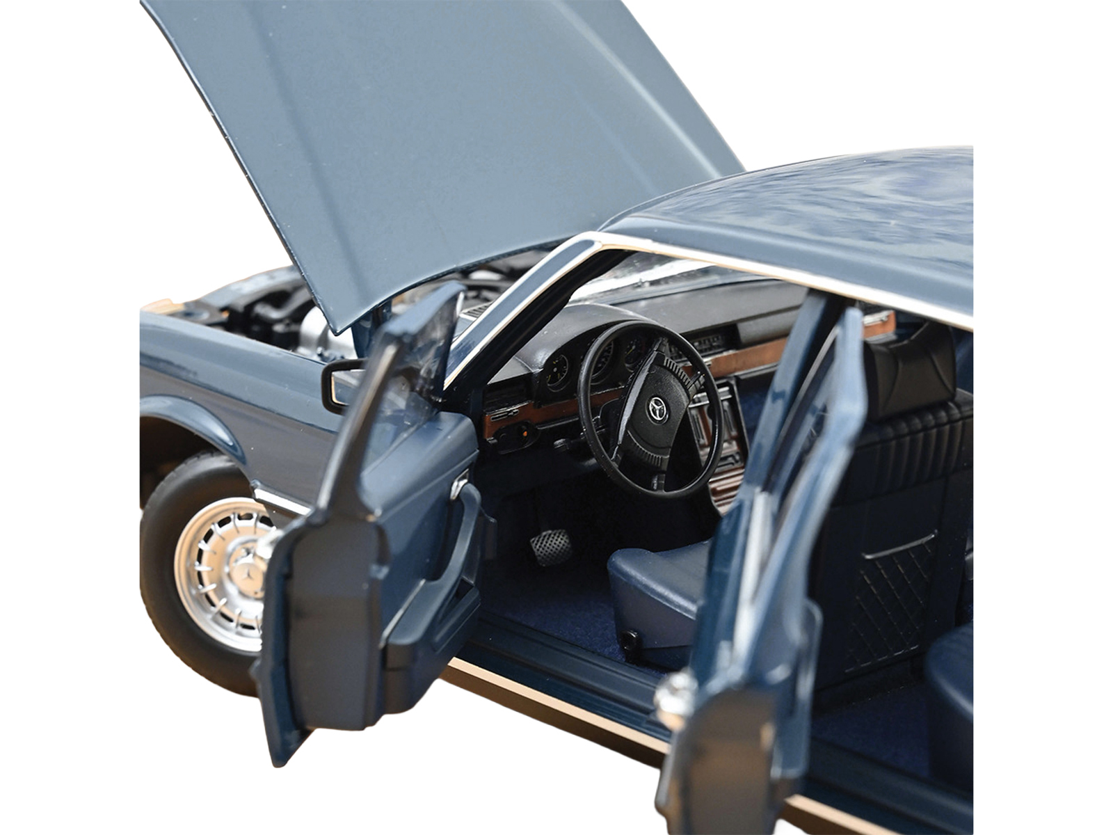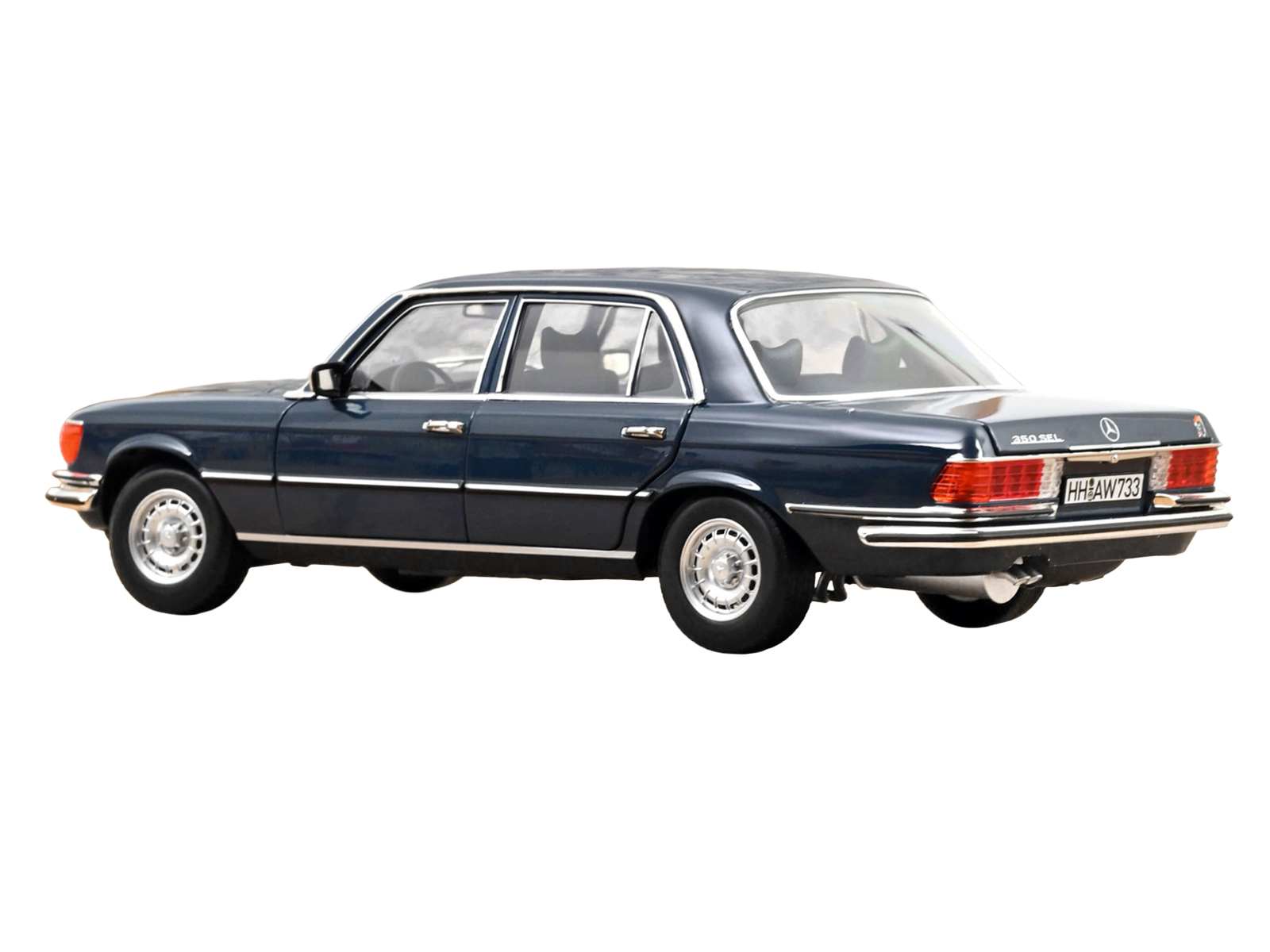 - Brand new 1/18 scale diecast car model of 1979 Mercedes-Benz 350 SEL Hansa Blue die cast model car by Norev.