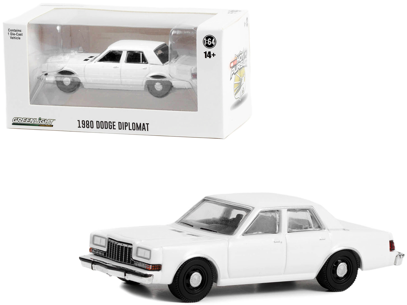 - Brand new 1/64 scale diecast car model of 1980-1989 Dodge Diplomat Police Unmarked White “Hot Pursuit” “Hobby Exclusive” Series die cast model car by Greenlight.