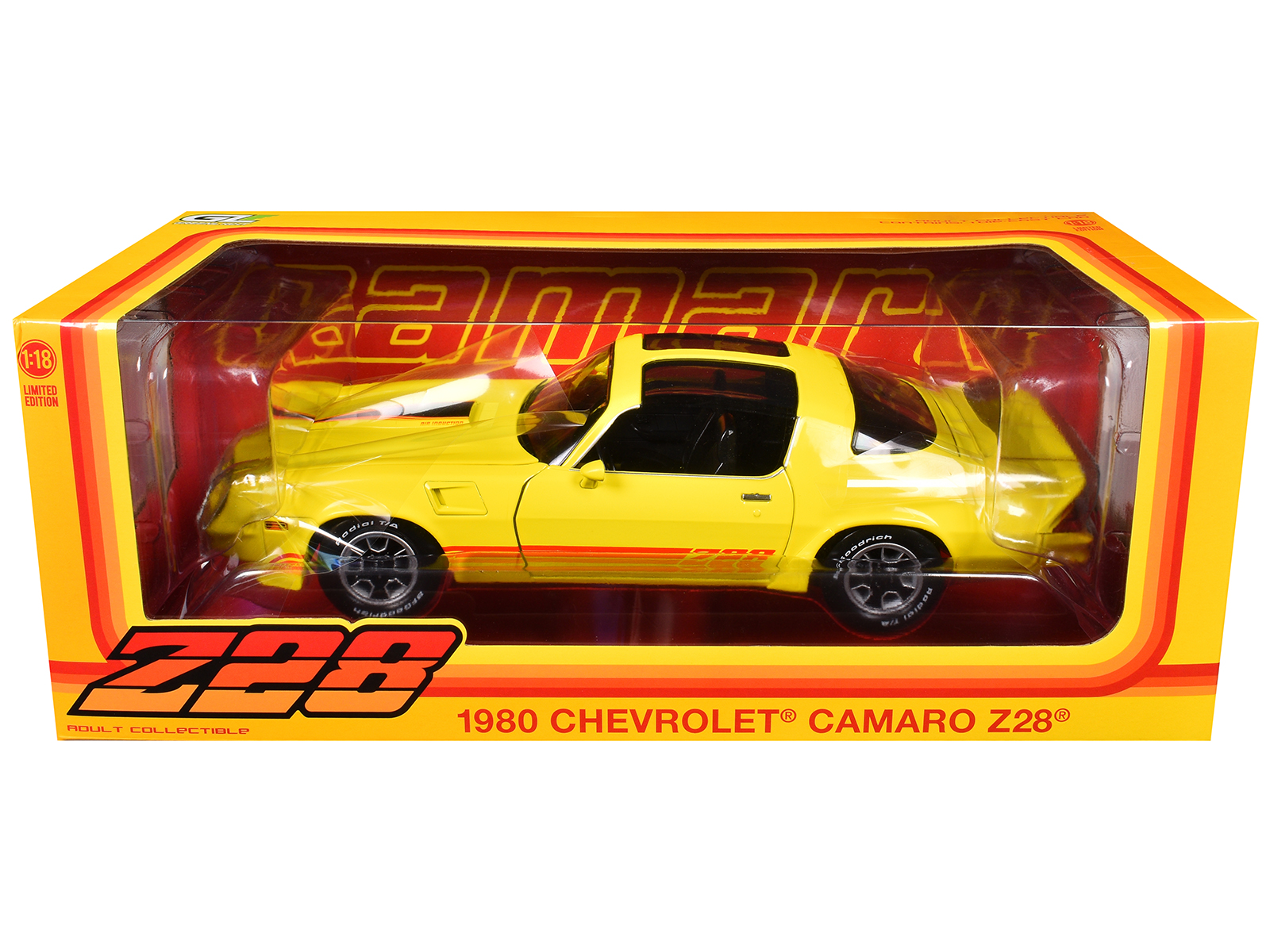 - Brand new 1/18 scale diecast car model of 1980 Chevrolet Camaro Z28 with T-Tops Bright Yellow with Stripes die cast model car by Greenlight.