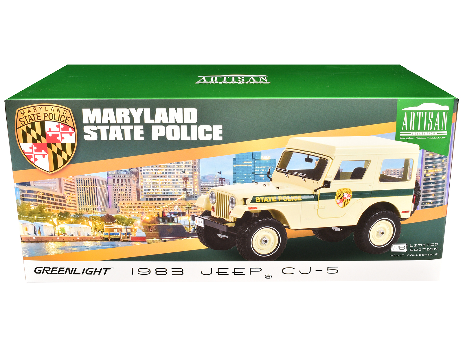 - Brand new 1/18 scale diecast car model of 1983 Jeep CJ-5 Hardtop “Maryland State Police” Beige with Green Stripes “Artisan Collection” Series die cast model car by Greenlight.