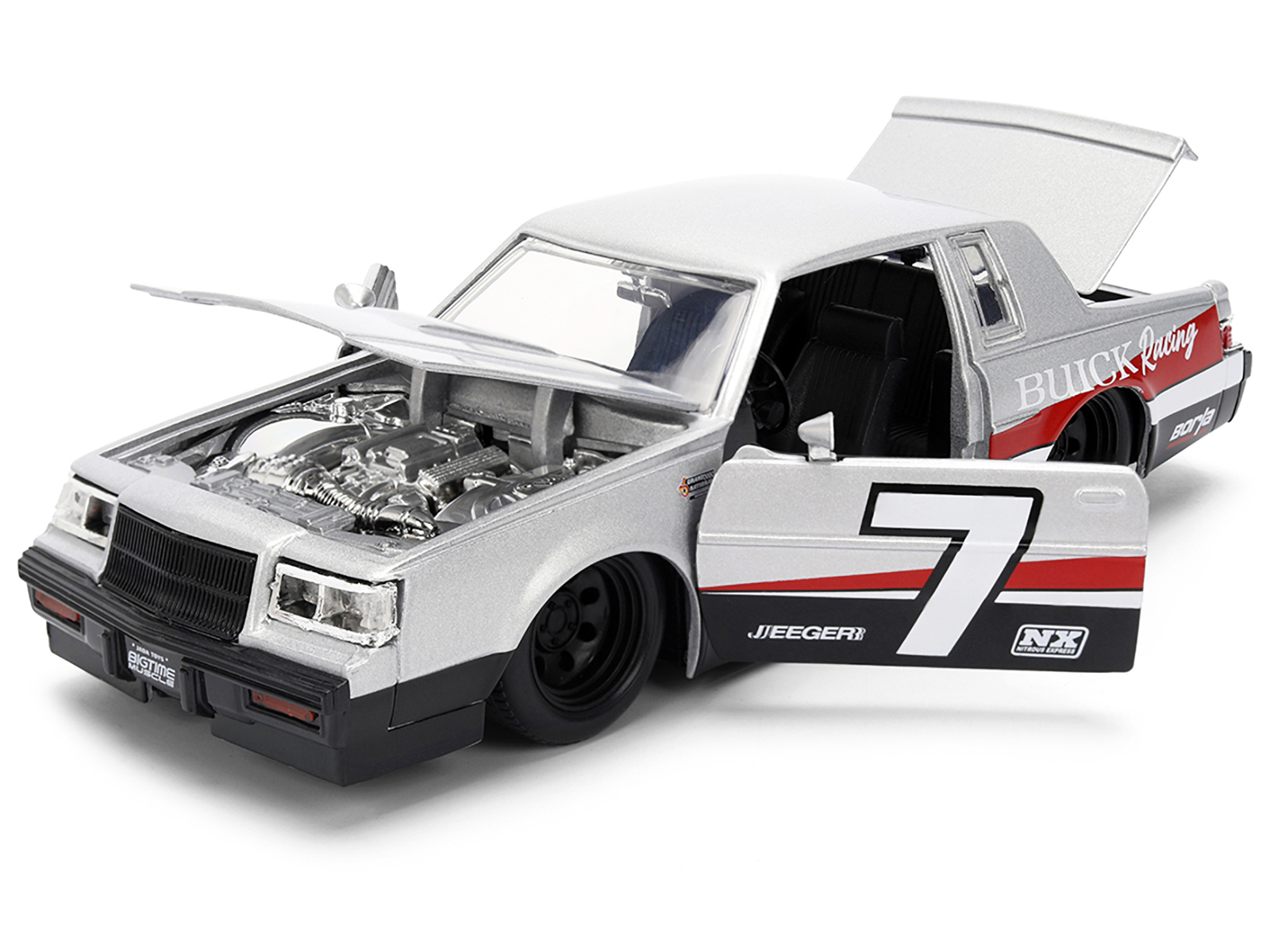 - Brand new 1/24 scale diecast model car of 1987 Buick Grand National #7 “Buick Racing” Matt Silver Metallic with Red and Black Stripes “Bigtime Muscle” Series die cast car model by Jada.