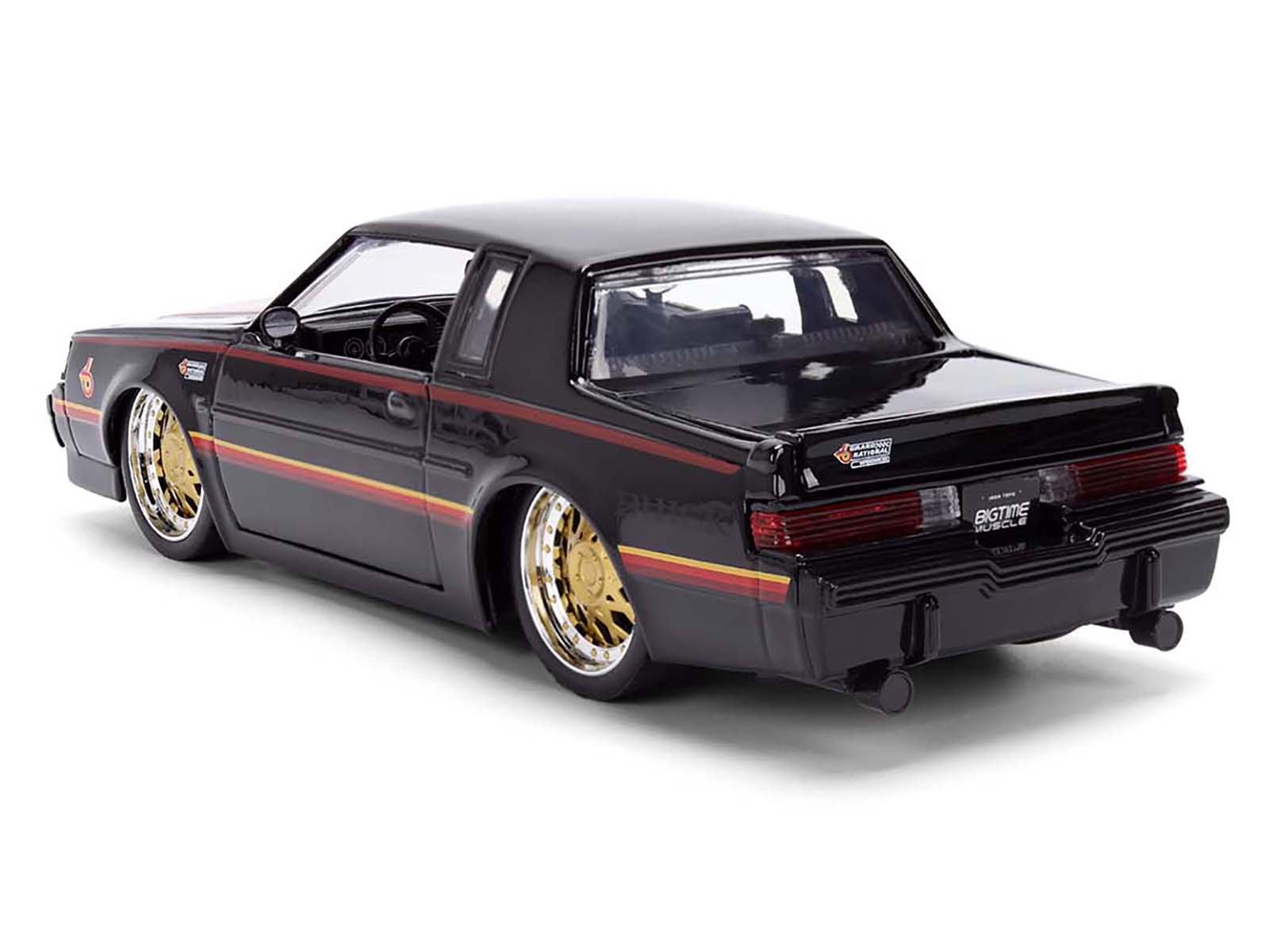 - Brand new 1/24 scale diecast model car of 1987 Buick Grand National Black with Matt Red Hood and Stripes “Bigtime Muscle” Series die cast car model by Jada.