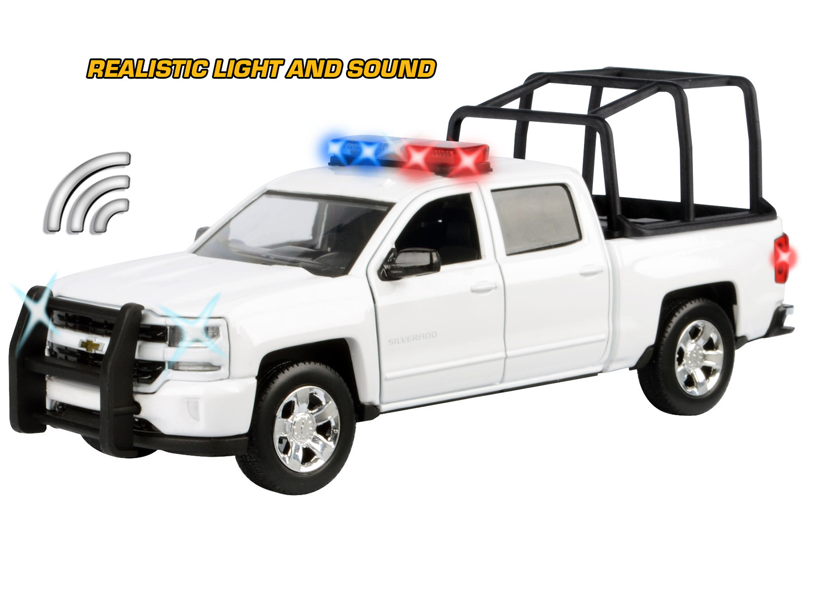 - Brand new 1/27 scale diecast car model of 2017 Chevrolet Silverado 1500 LT Z71 Crew Cab Pickup Truck with White with Flashing Light Bar and Front and Rear Lights and Sounds die cast model car by Motormax.