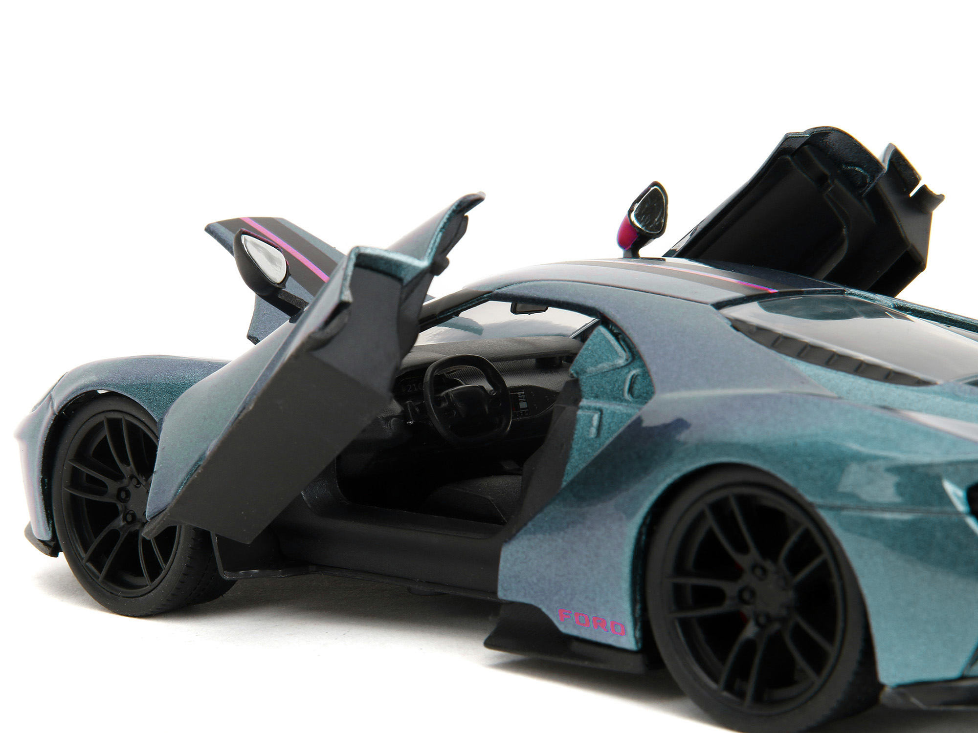 - Brand new 1/24 scale diecast car model of 2017 Ford GT Blue Metallic with Pink and Black Stripes “Pink Slips” Series die cast model car by Jada.