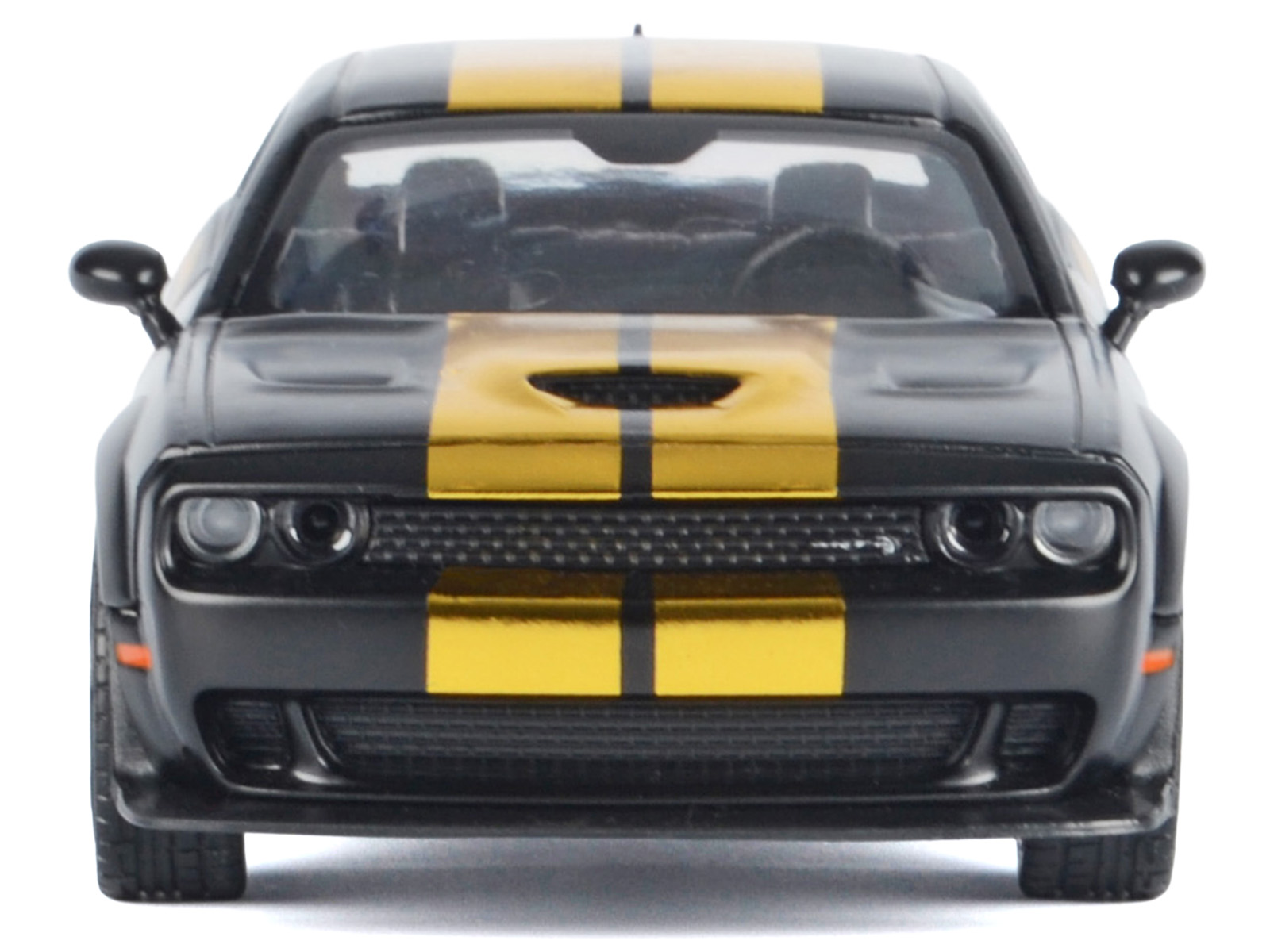 - Brand new 1/24 scale diecast car model of 2018 Dodge Challenger SRT Hellcat Widebody Matt Black with Gold Stripes and Graphics “Midnight Eclipse” Series die cast model car by Motormax.