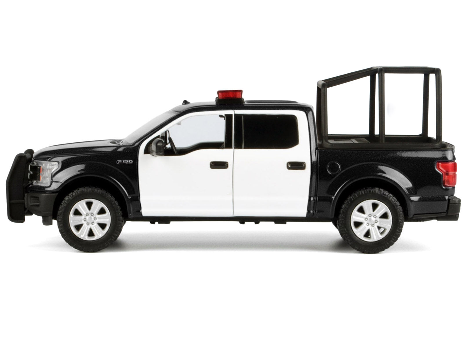 - Brand new 1/27 scale diecast car model of 2019 Ford F-150 Lariat Crew Cab Pickup Truck with Bed Cage Black and White with Flashing Light Bar and Front and Rear Lights and Sounds die cast model car by Motormax.