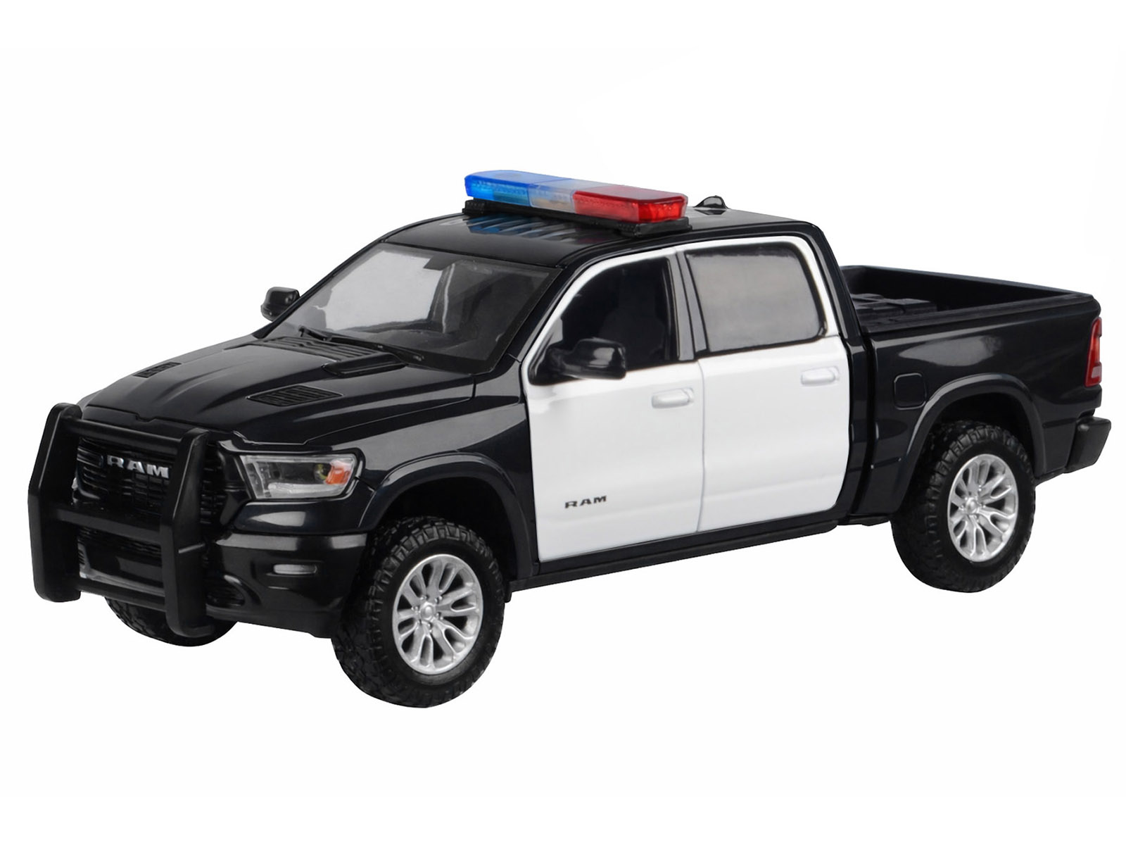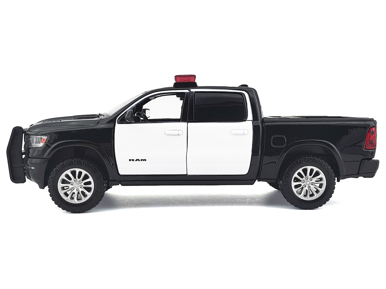 - Brand new 1/27 scale diecast car model of 2019 RAM 1500 Laramie Crew Cab Pickup Truck Black and White with Flashing Light Bar and Front and Rear Lights and Sounds die cast model car by Motormax.