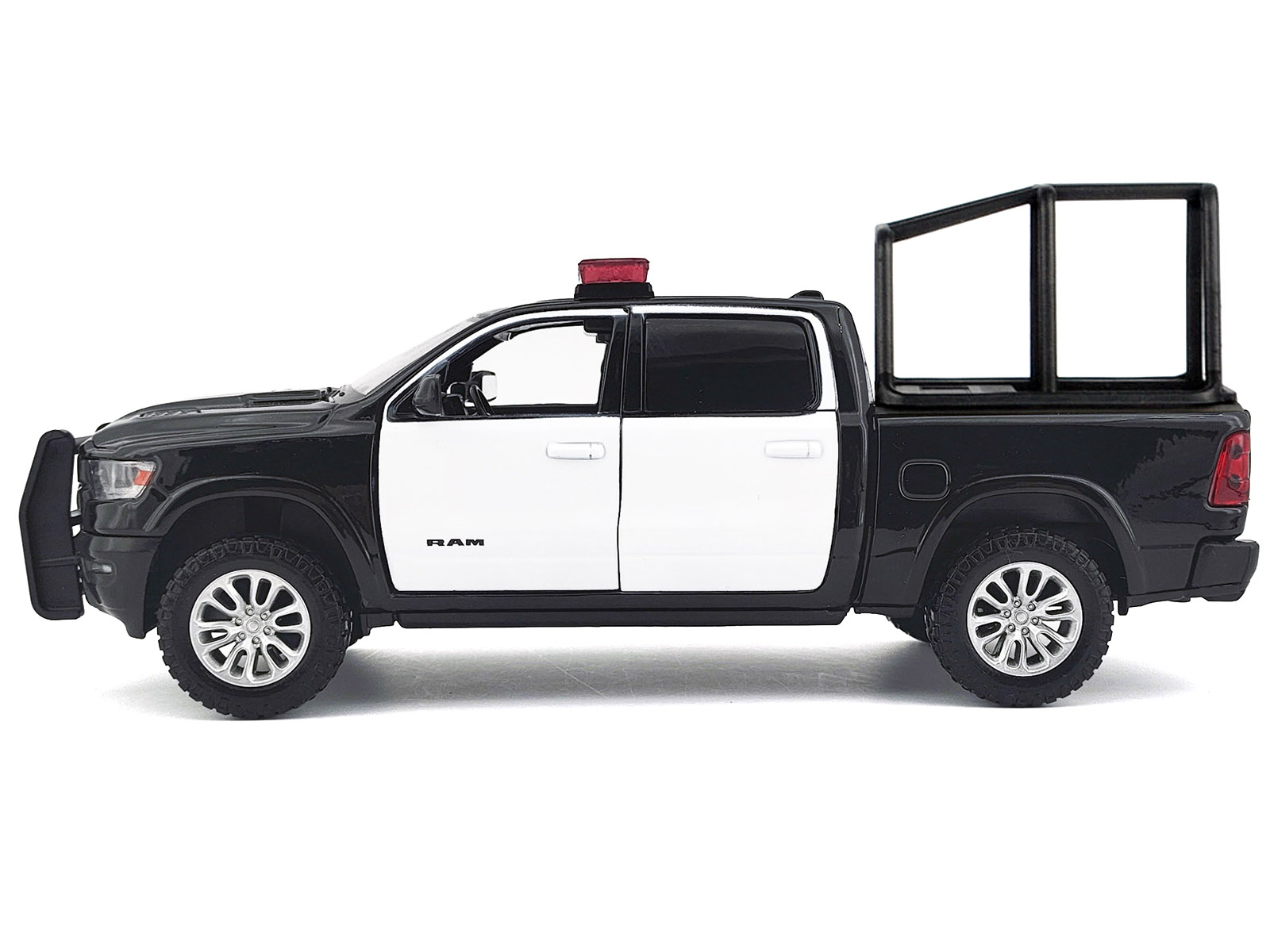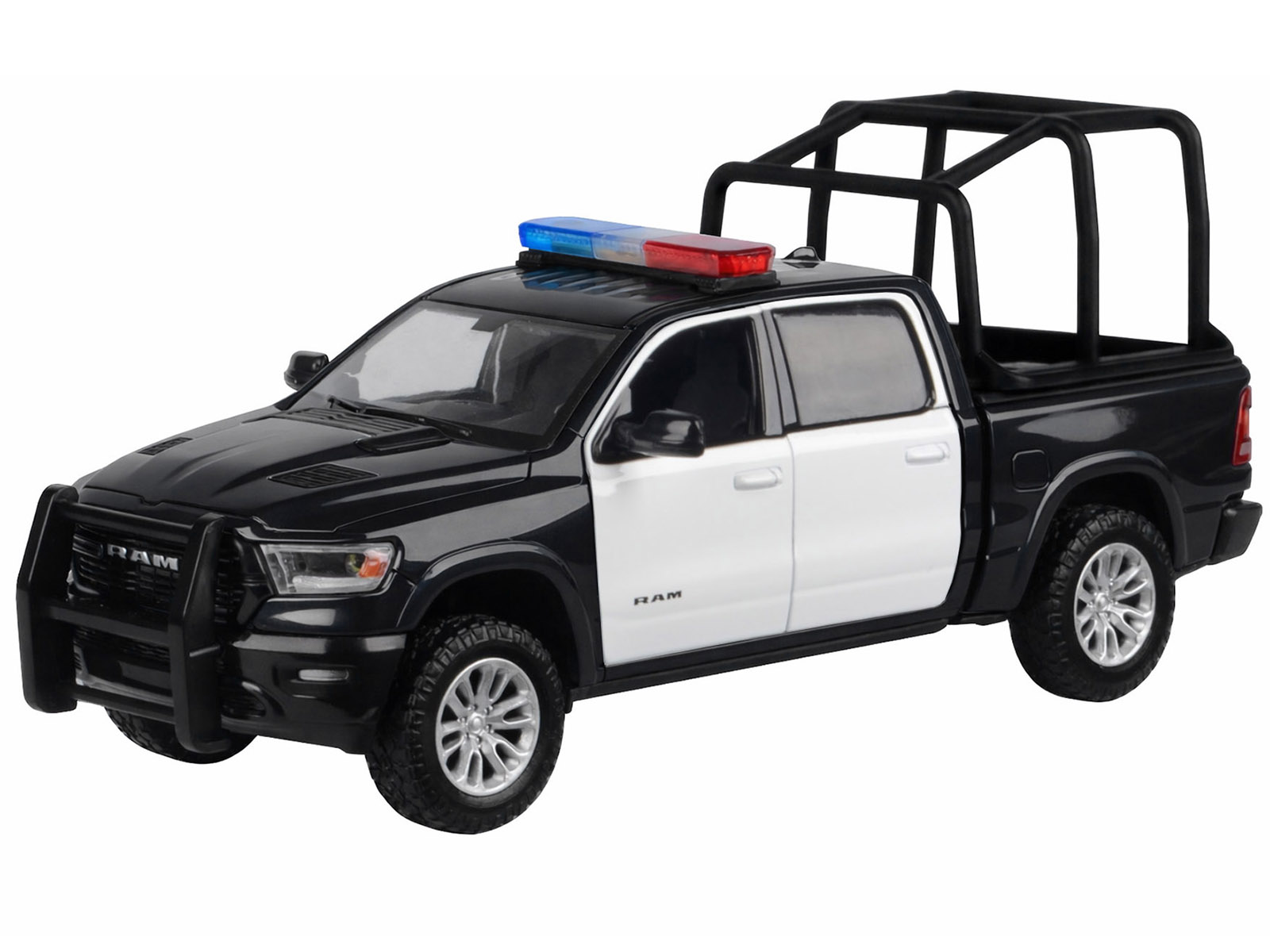 - Brand new 1/27 scale diecast car model of 2019 RAM 1500 Laramie Crew Cab Pickup Truck with Bed Cage Black and White with Flashing Light Bar and Front and Rear Lights and Sounds die cast model car by Motormax.
