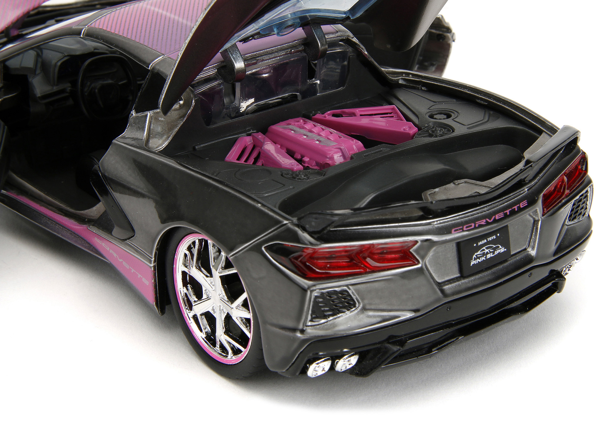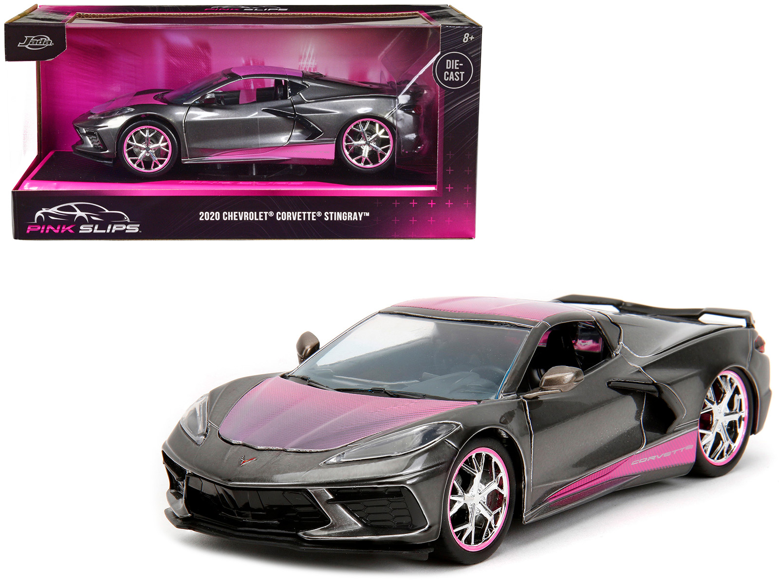 - Brand new 1/24 scale diecast car model of 2020 Chevrolet Corvette Stingray Gray Metallic with Pink Carbon Hood and Top “Pink Slips” Series die cast model car by Jada.