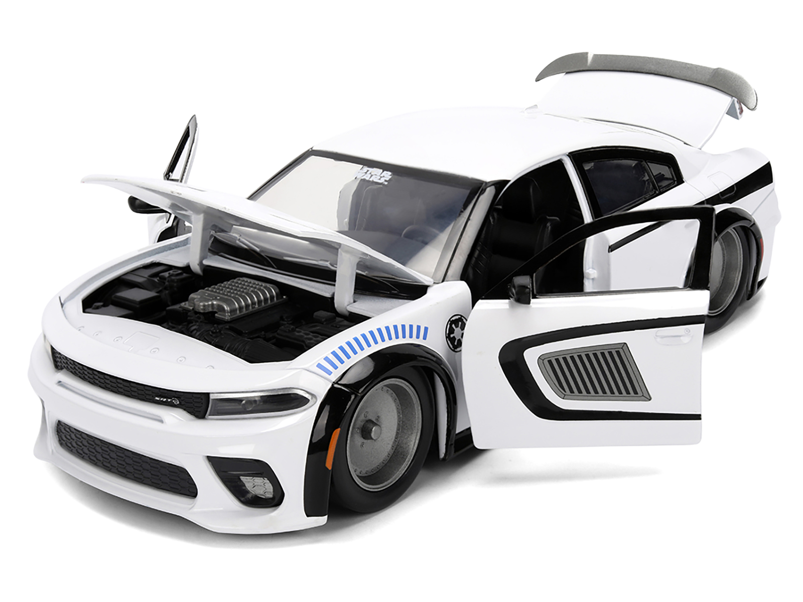 - Brand new 1/24 scale diecast car model of 2021 Dodge Charger SRT Hellcat White with Graphics and Stormtrooper Figure “Star Wars” Franchise “Hollywood Rides” Series die cast model car by Jada.