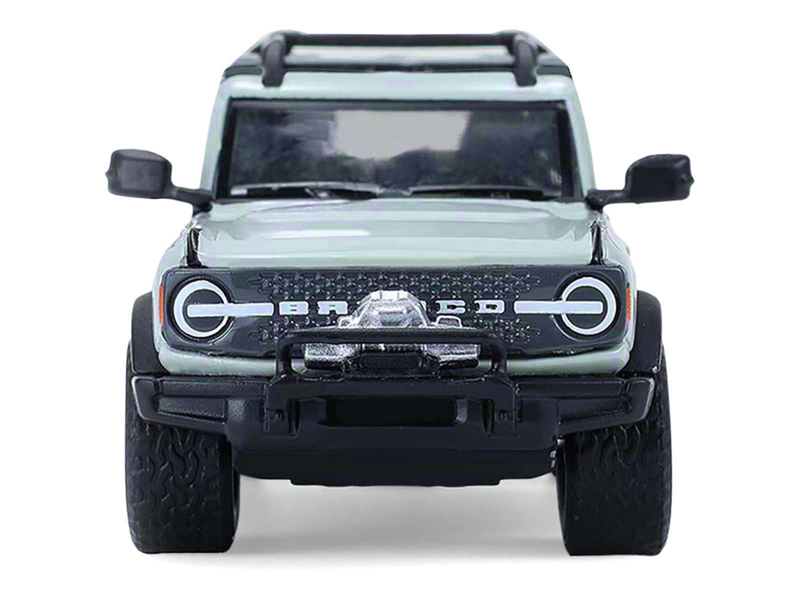 - Brand new 1/64 scale diecast car models of 2021 Ford Bronco 4-Door Badlands Cactus Gray with Black Top and Motorcycle with Utility Trailer “Hitch & Tow” Series 33 die cast model cars by Greenlight.