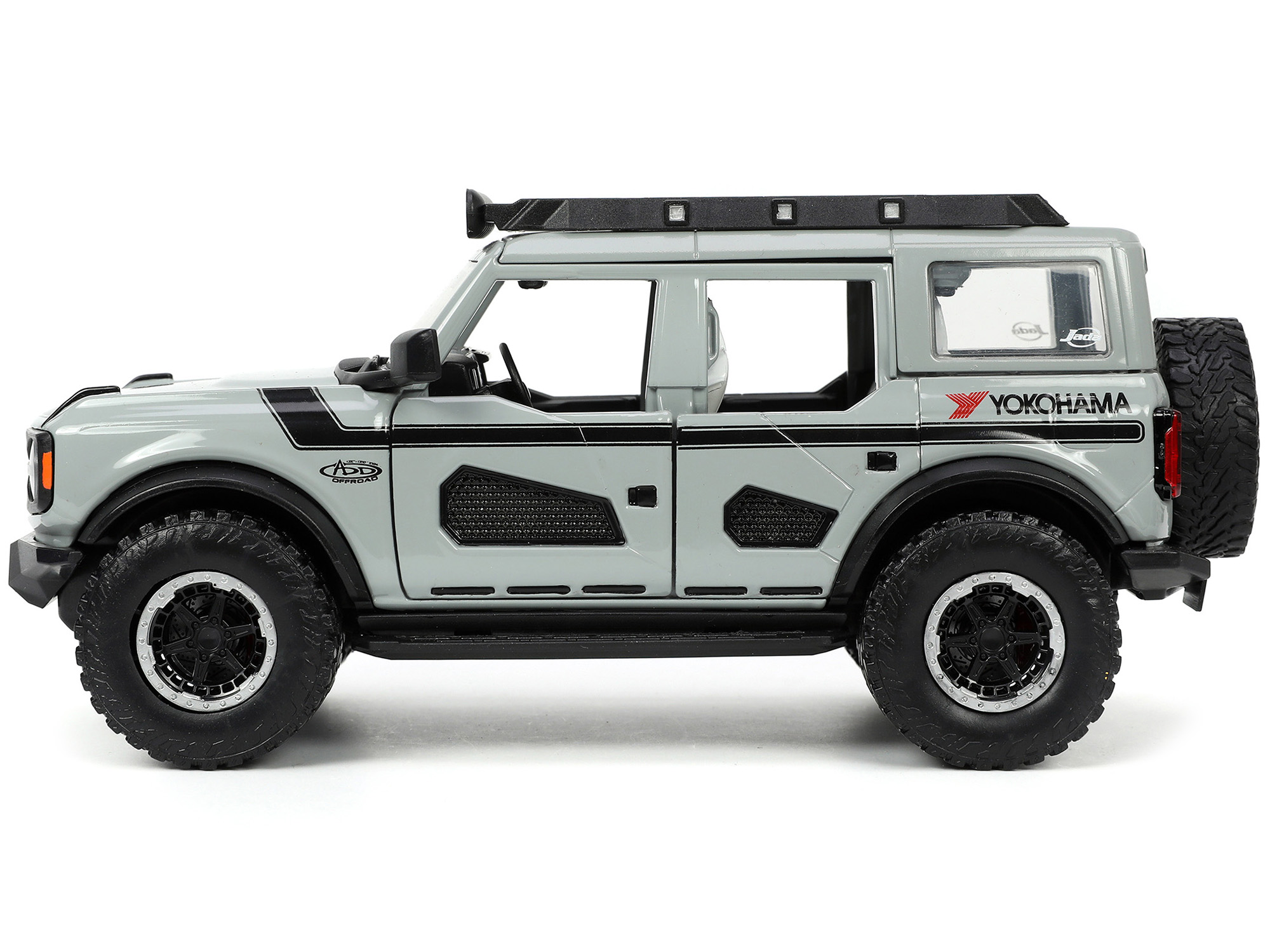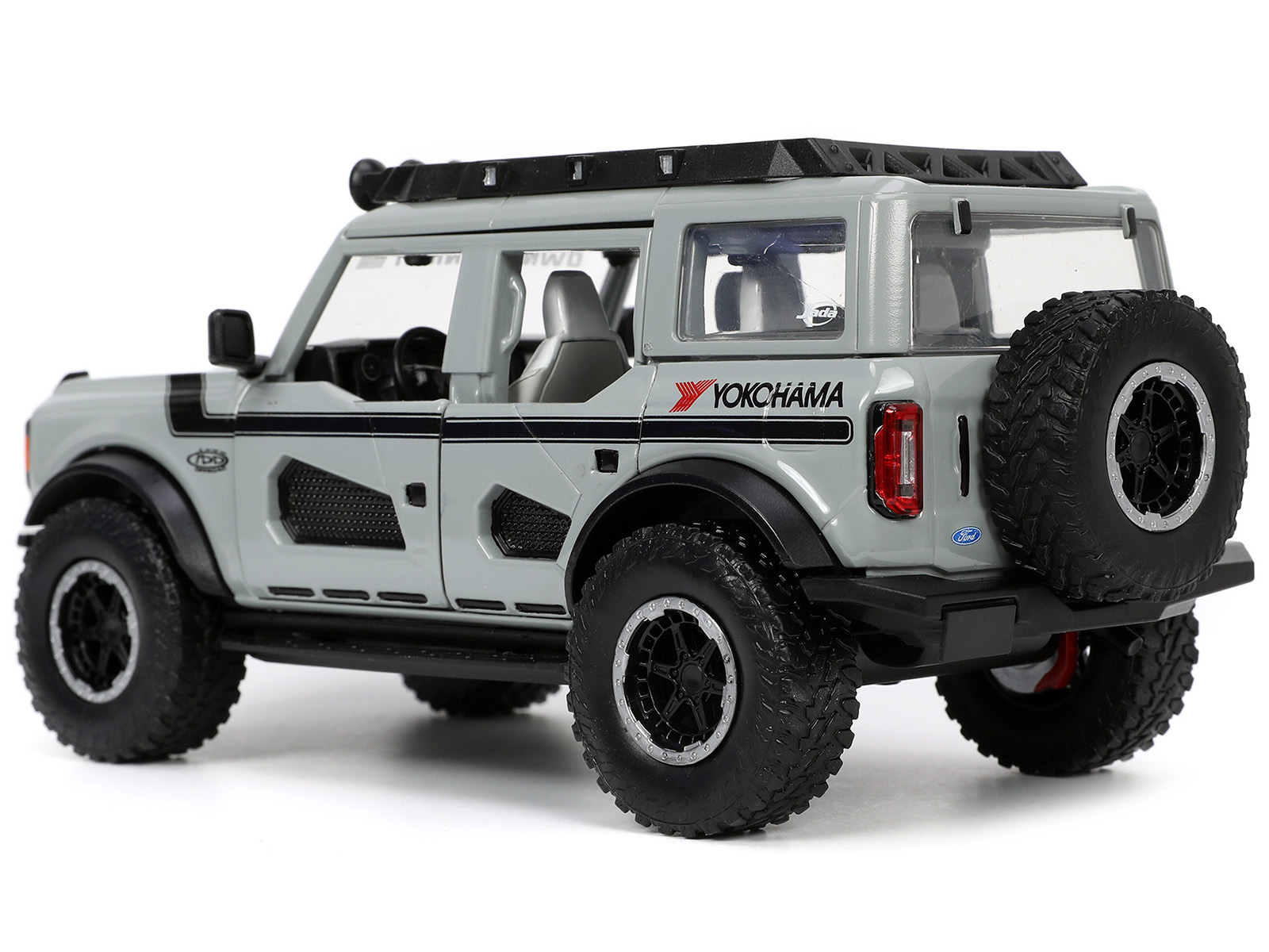 - Brand new 1/24 scale diecast car model of 2021 Ford Bronco Gray with Black Stripes with Roof Rack “Own the Night” “Just Trucks” Series die cast model car by Jada.