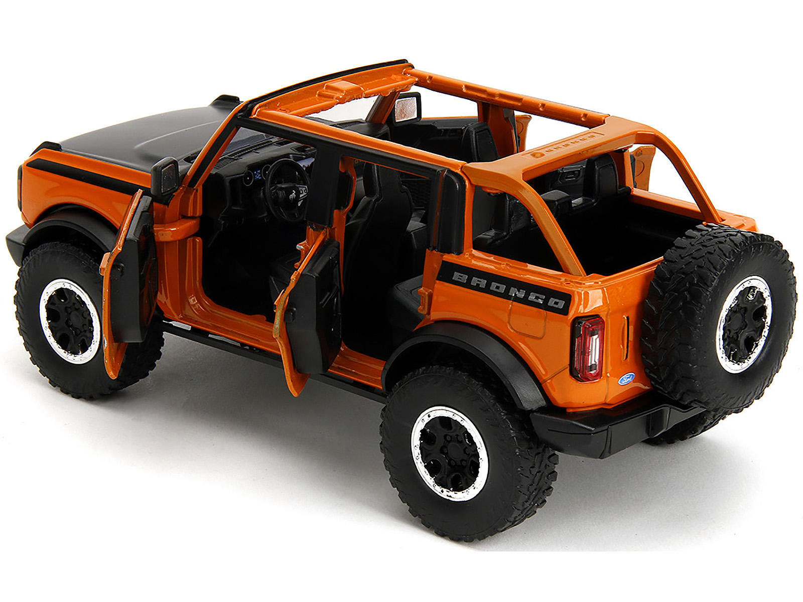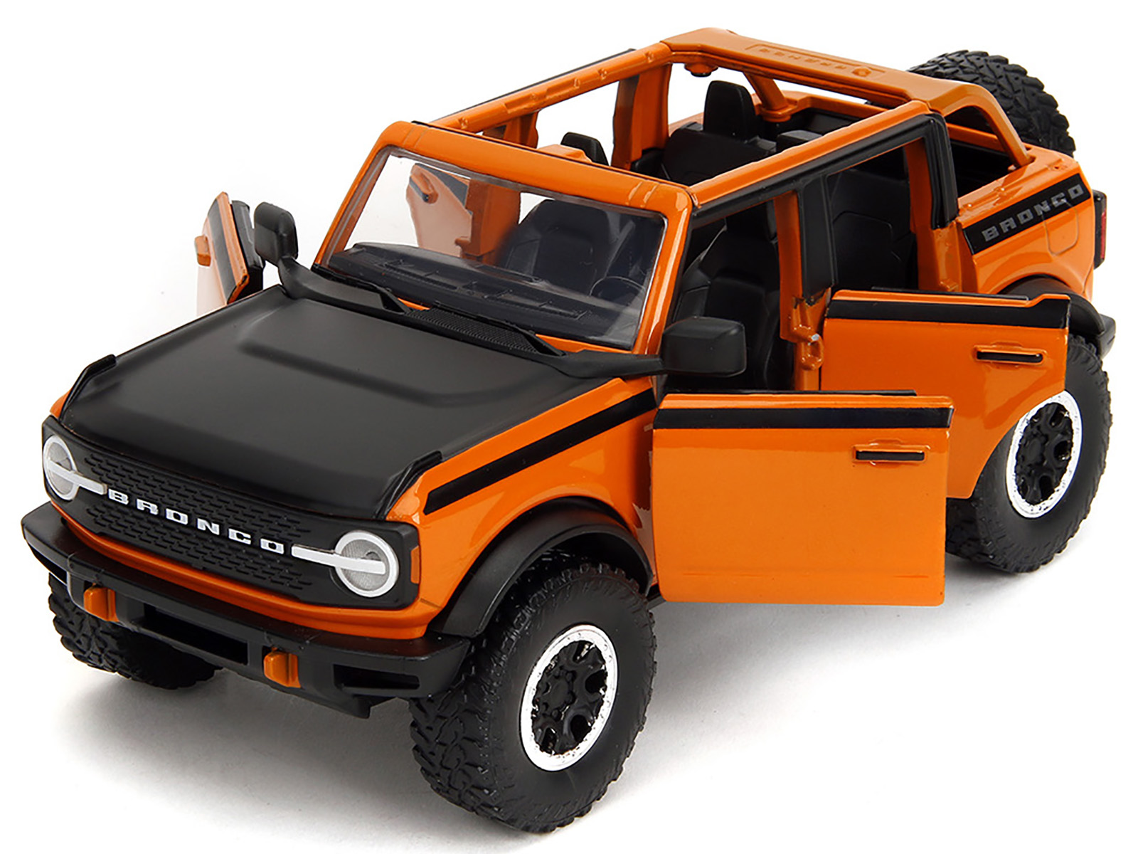 - Brand new 1/24 scale diecast car model of 2021 Ford Bronco Open-Top Orange with Black Stripes and Hood with Extra Wheels “Just Trucks” Series die cast model car by Jada.