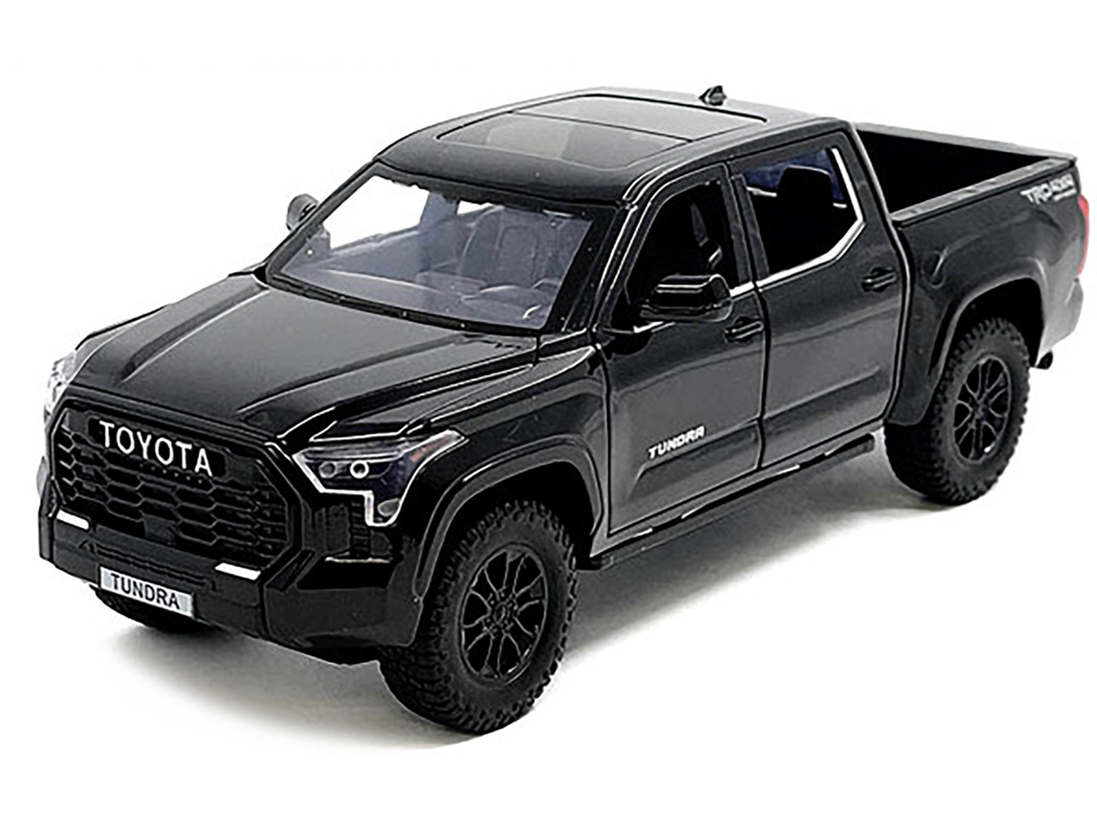 - Brand new 1/24 scale diecast car model of 2023 Toyota Tundra TRD 4×4 Pickup Truck Black with Sunroof and Wheel Rack die cast model car.