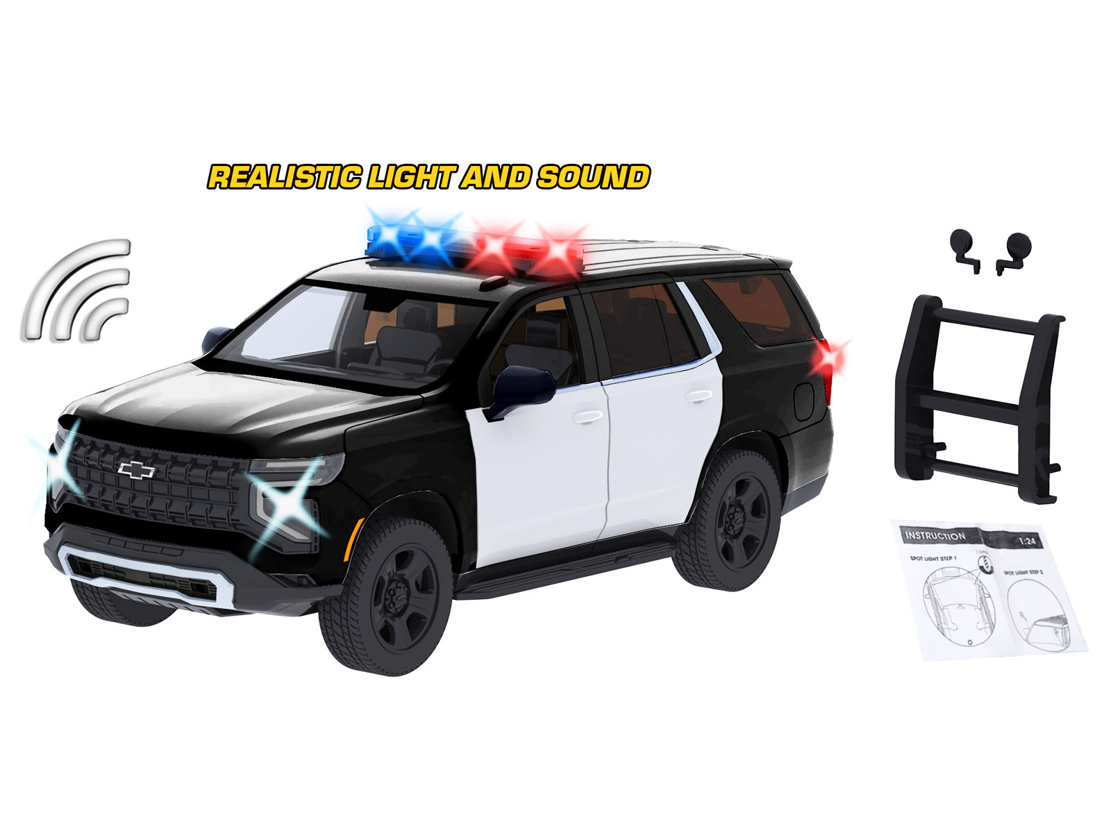 - Brand new 1/24 scale diecast car model of 2025 Chevrolet Tahoe PPV Black and White “Builder’s Kit” with Flashing Light Bar and Front and Rear Lights and Sounds die cast model car by Motormax.
