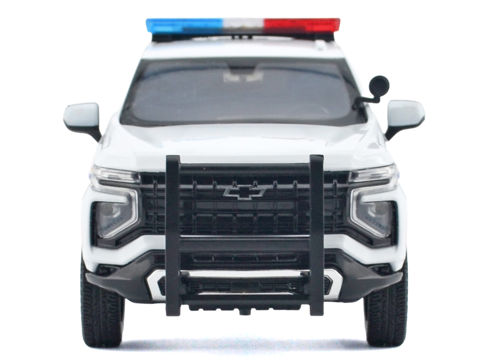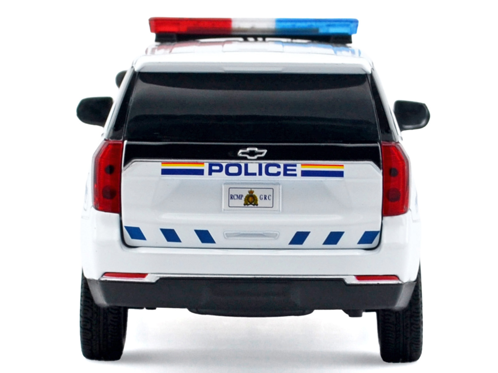 - Brand new 1/24 scale diecast car model of 2025 Chevrolet Tahoe PPV “RCMP (Royal Canadian Mounted Police)” White with Stripes with Flashing Light Bar and Front and Rear Lights and Sounds die cast model car by Motormax.