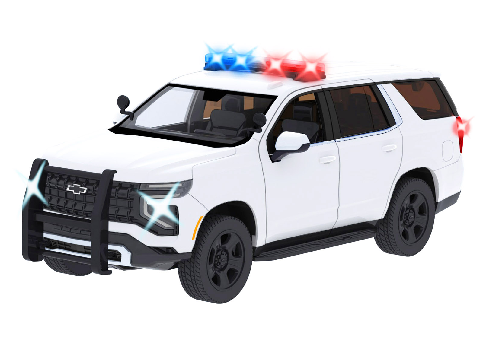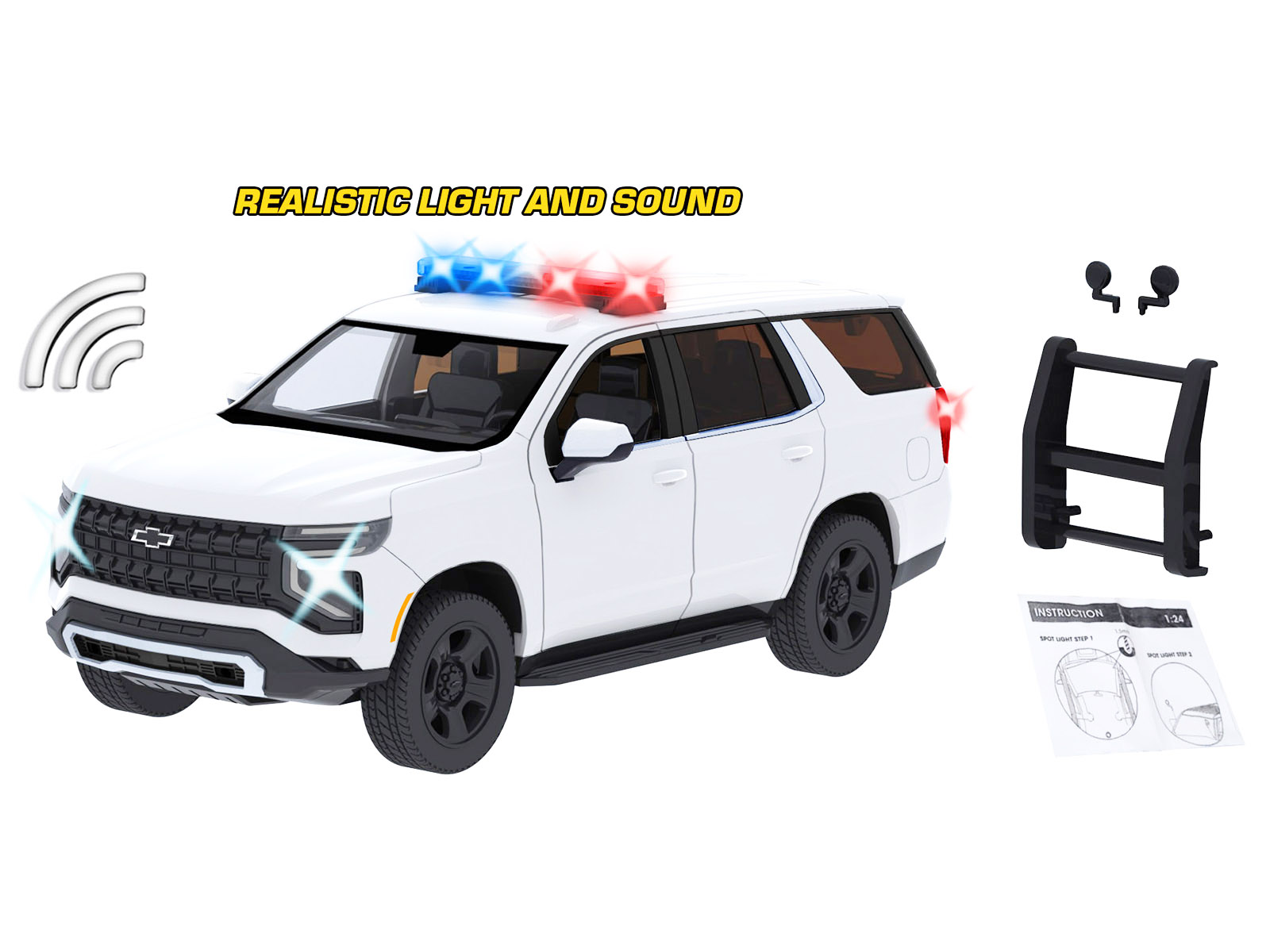 - Brand new 1/24 scale diecast car model of 2025 Chevrolet Tahoe PPV White “Builder’s Kit” with Flashing Light Bar and Front and Rear Lights and Sounds die cast model car by Motormax.