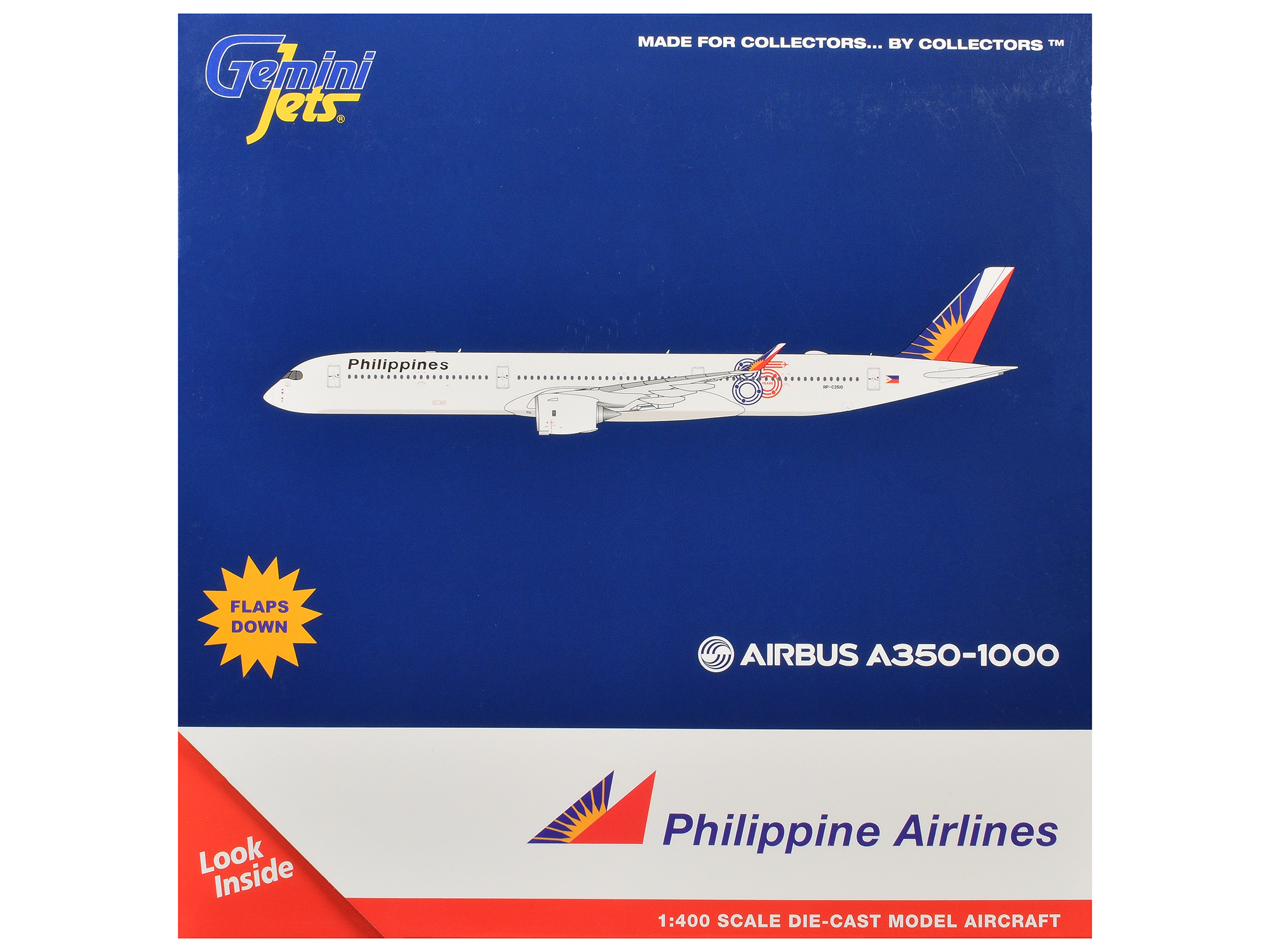 - Brand new 1/400 scale diecast airplane model of Airbus A350-1000 Commercial Aircraft with Flaps Down “Philippine Airlines – 85 Years” (RP-C3510) White with Tail Graphics die cast model by GeminiJets.