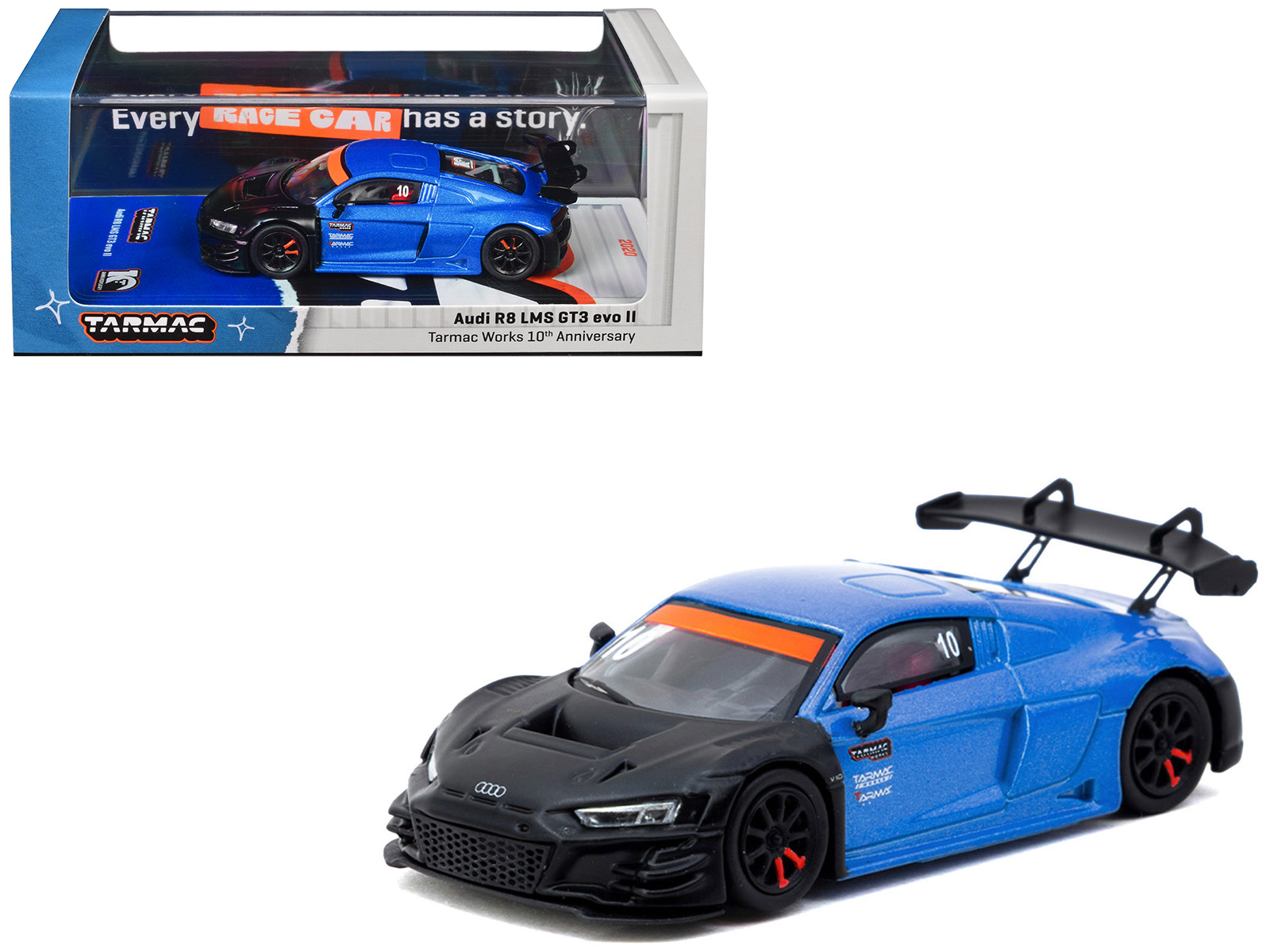 - Brand new 1/64 scale diecast model car of Audi R8 LMS GT3 evo II #10 “Tarmac Works 10th Anniversary” Blue Metallic and Matt Black “Hobby64” Series die cast model car by Tarmac Works.