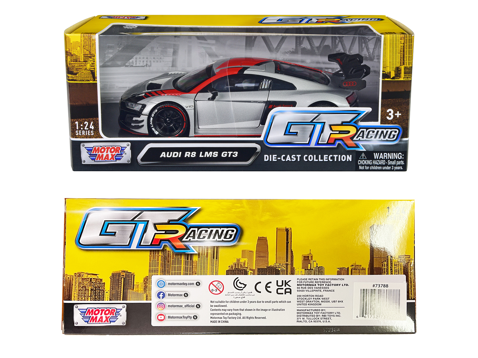 - Brand new 1/24 scale diecast car model of Audi R8 LMS GT3 Silver Metallic with Graphics “GT Racing” Series die cast model car by Motormax.