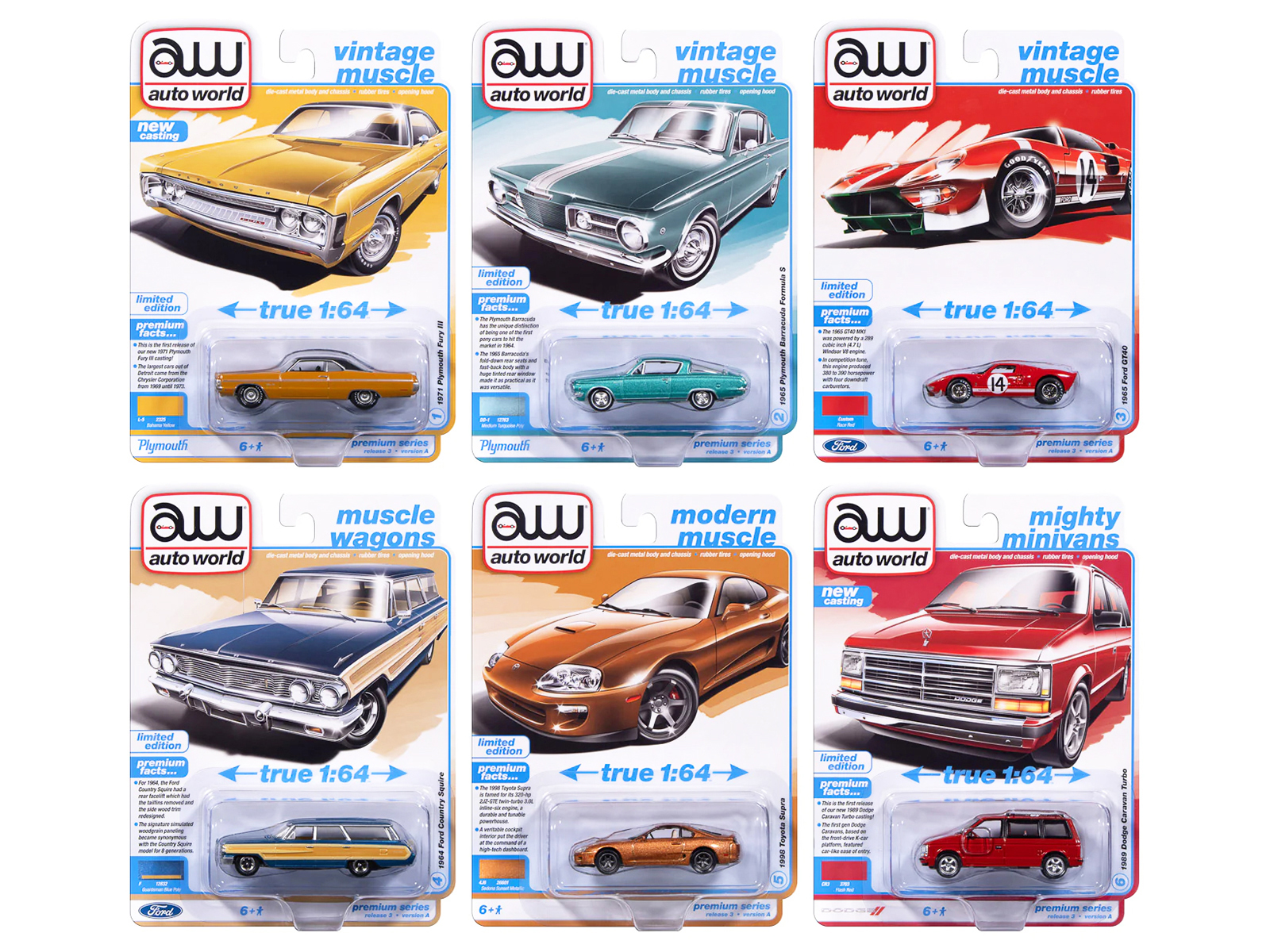 - Brand new 1/64 scale diecast car models of Auto World Premium 2025 Release 3 Set A of 6 pieces die cast model cars by Auto World.