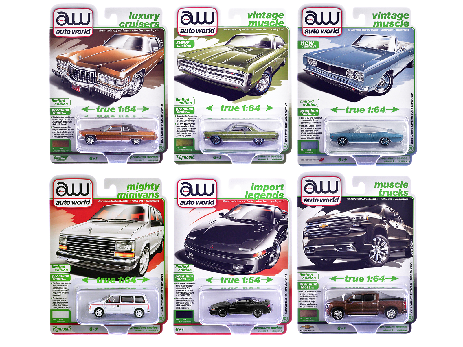 - Brand new 1/64 scale diecast car models of Auto World Premium 2026 Release 1 Set A of 6 pieces die cast model cars by Auto World.