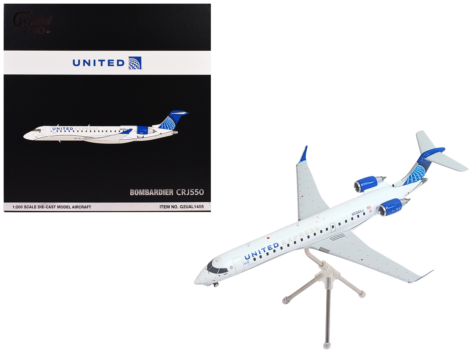 - Brand new 1/200 scale diecast airplane model of Bombardier CRJ550 Commercial Aircraft “United Express” (N506GJ) White with Blue Tail “Gemini 200” Series die cast model by GeminiJets.