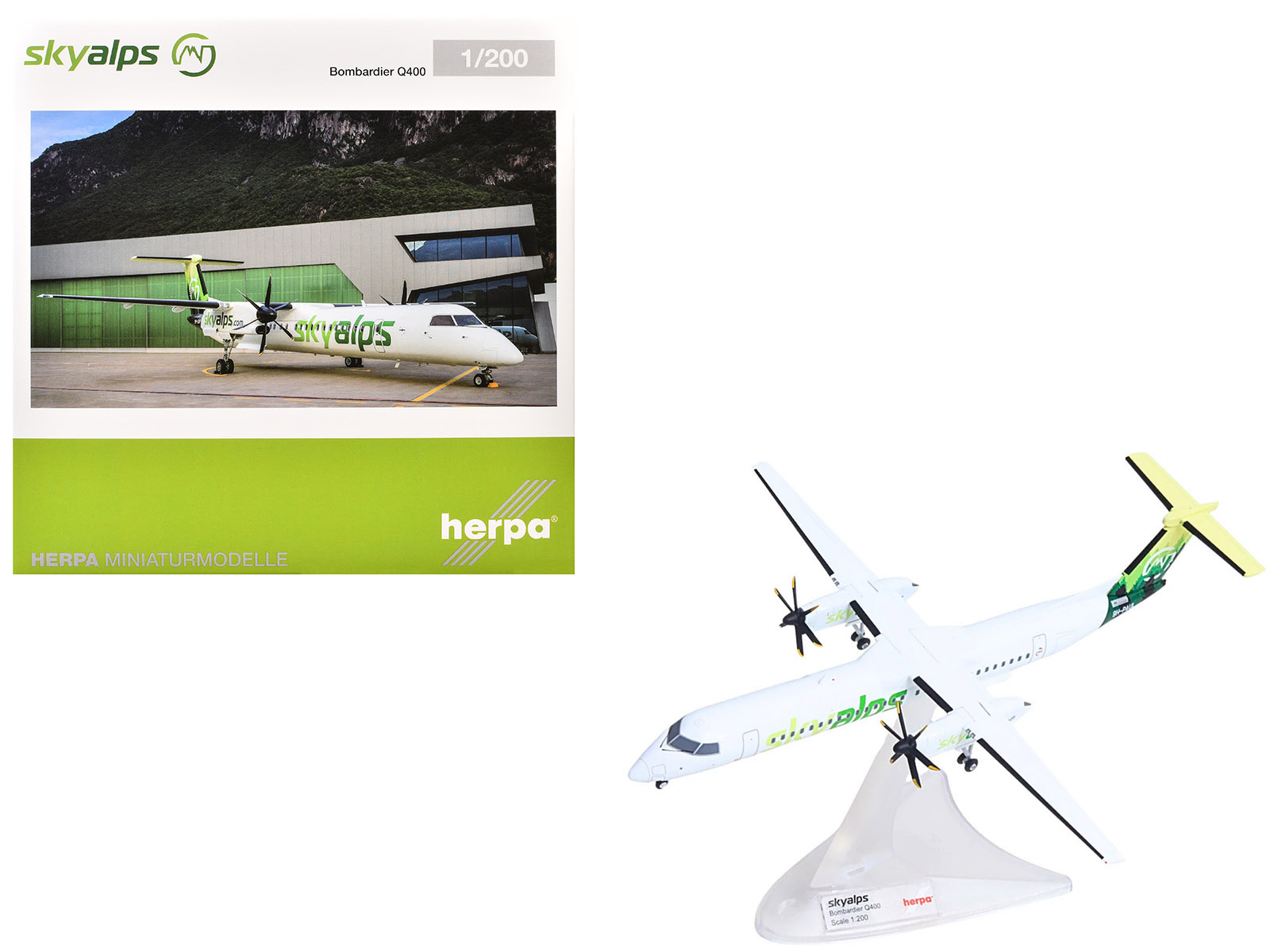 - Brand new 1/200 scale diecast airplane model of Bombardier Q400 Commercial Aircraft “Sky Alps” (9H-PAUL) White with Green Tail Graphics die cast model by Herpa.